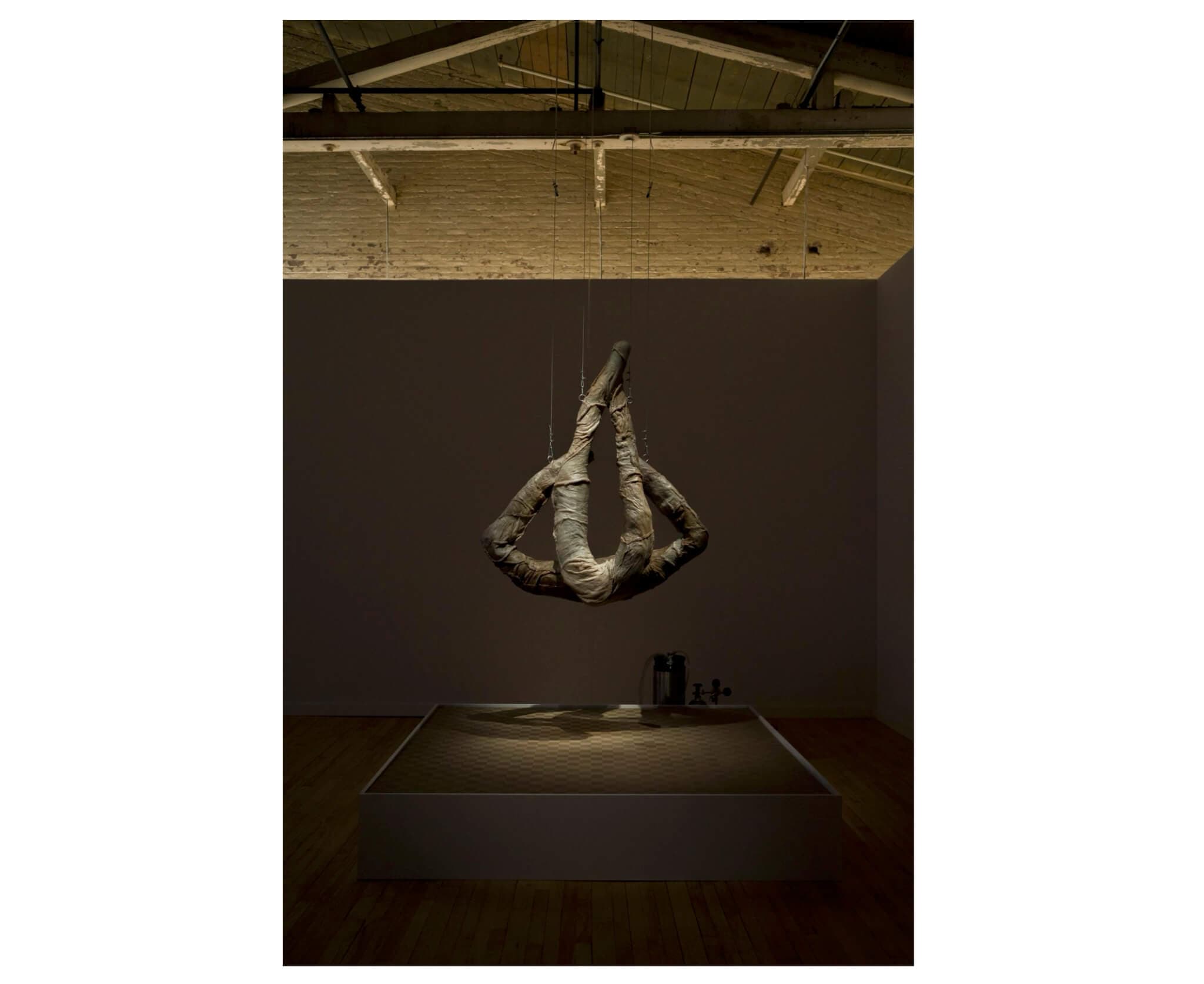 Similarly, though the exhibition text informs us that Möller’s flesh-like sculptures embody “the impermanence and malleability of relationships,” these prescribed interpretations seem extraneous next to the physical experience of the work. Möller’s flesh-like forms are made with living scoby that bears an eerie resemblance to skin and slowly dries in what resembles stages of mummification; they make my own skin crawl in sympathy. In an interview with CanvasRebel, Möller, a Chinese Swedish artist living and working in New York, describes their work with kombucha scoby as focused on “corporeal potential.” Though their work with scoby has the feel of a true origin story—they were gifted the culture on an unsuccessful trip to China to find their birth mother—they do not draw a clear line between their birth heritage and their work. Instead, they speak most of the transience of the material and its forms, and occasionally about the kombucha “mother,” or original culture, from which all works are made.