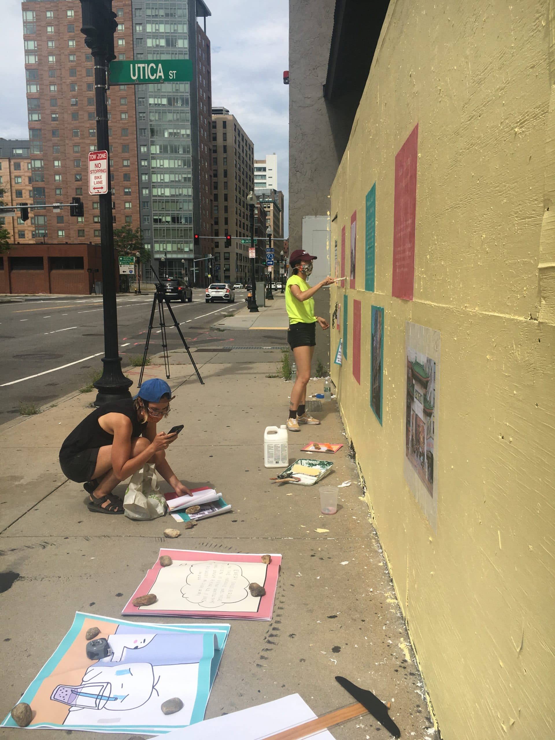 Artists Lily Xie and Crystal Bi Wegner installing Our Chinatown, wheatpaste mural at 150 Kneeland Street. Photo courtesy of Space Us.