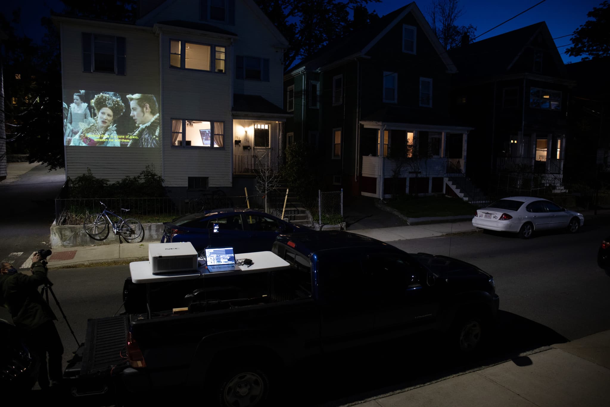 Laine Rettmer, installation view of Play it Safe, live projection on a Somerville artist’s home, part of an urban art intervention series produced and curated by Pamela Hersch with David Guerra.