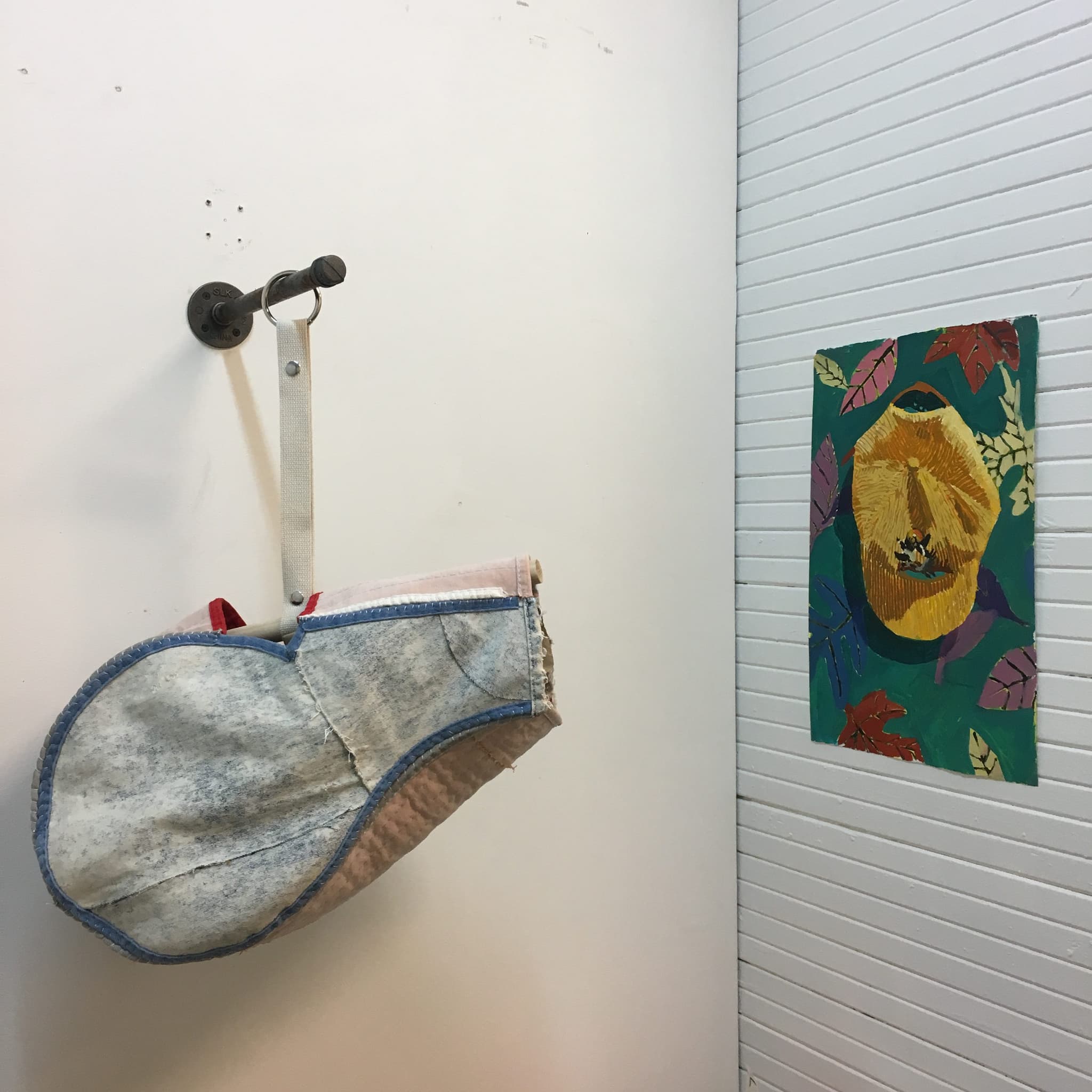 This female independence and assertion seamlessly flows through Melanie Bernier’s work. As a zero-waste artist, Bernier works with found materials and clothing that create a conversation with the reworking of fabrics, creating a secondhand feel that entices the viewer with its familiarity. Beyond the material, the objects she has created recall schooltime objects. A whistle, a deflated basketball and a drum all exist in the subconscious of students everywhere and evoke a sense of touch and viewer participation. Without air in the whistle and basketball, they lay deflated; as does the snare drum lay silent without the tap of a drumstick. Bernier elevates this participatory spirit to a feminist level by adding the words “NO” and “OH WELL” to the pieces, perhaps pithy notes that engage with notions of action and inaction, giving voice to those previously silenced, flipping the construct of who initiates action and who is allowed to touch who, where. The denim jackets she has embroidered evoke the feminine method of needlepoint and embroidery, as Riesing’s work did, and hers take on the breadth of female expression by asserting themselves as respectable artworks, not mere handiwork as the crafts displayed normally are. Furthermore, as both artists work with clothing and fabrics, media typically associated with fashion and not the fine arts, they demolish the barriers between the two and suggest the performance of identity intrinsic in clothing choice incites powerful progress in power and position, both personally and politically.
