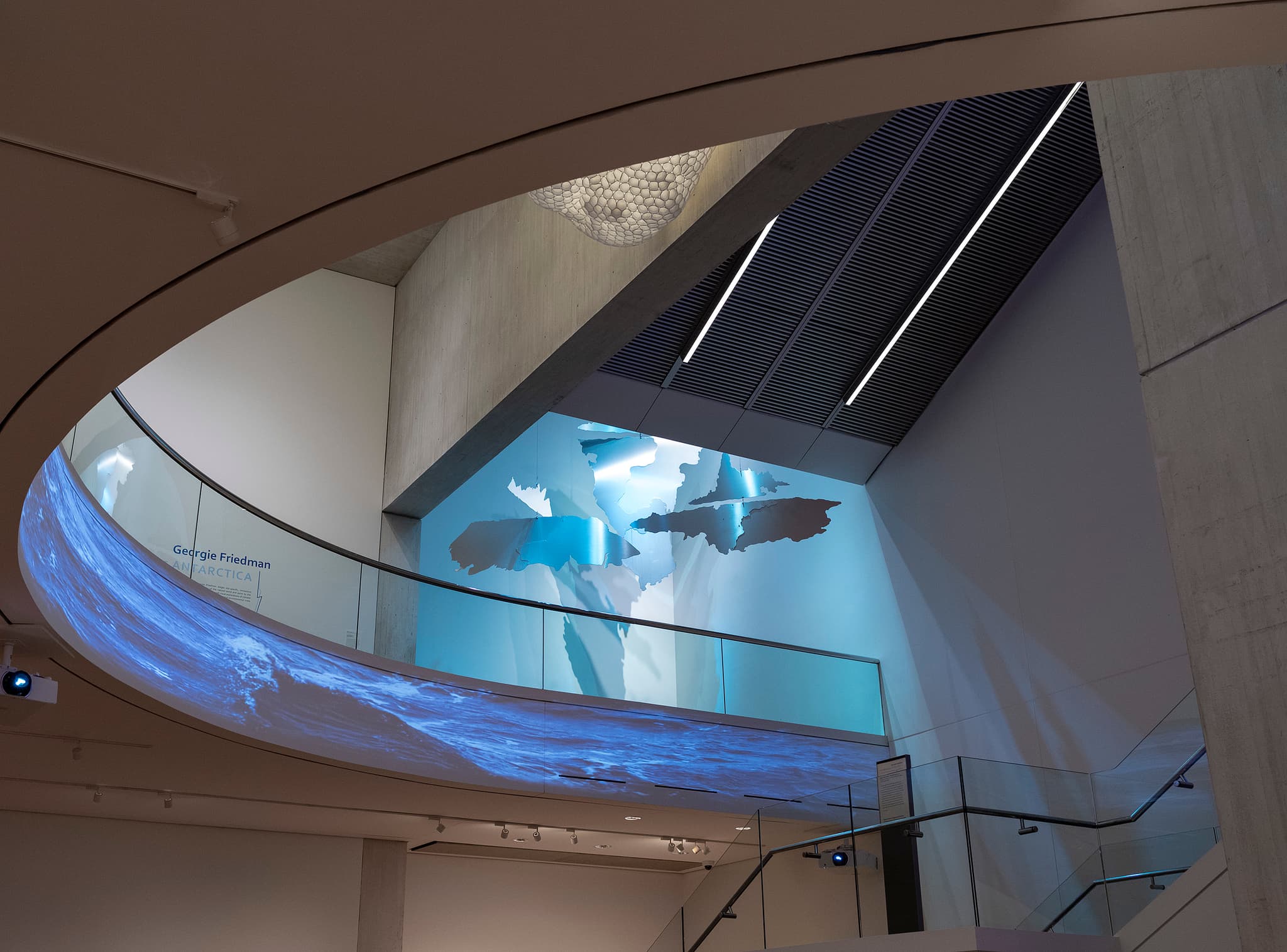 In her current exhibition at the Museum of Fine Arts, Boston, “Fragments of Antarctica,” multidisciplinary artist Georgie Friedman shares an expanded view of one of the most untouched parts of the world. Known for her site-specific video installations, The Boston-based artist makes work that probes the relationship between natural phenomena and human fragility, exploring the emergent psychological, societal, and power relationships between human and environmental forces. In her most recent installation, it becomes impossible to ignore our planet’s climate crisis while immersed in a striking view of what remains of Antarctica’s icebergs.