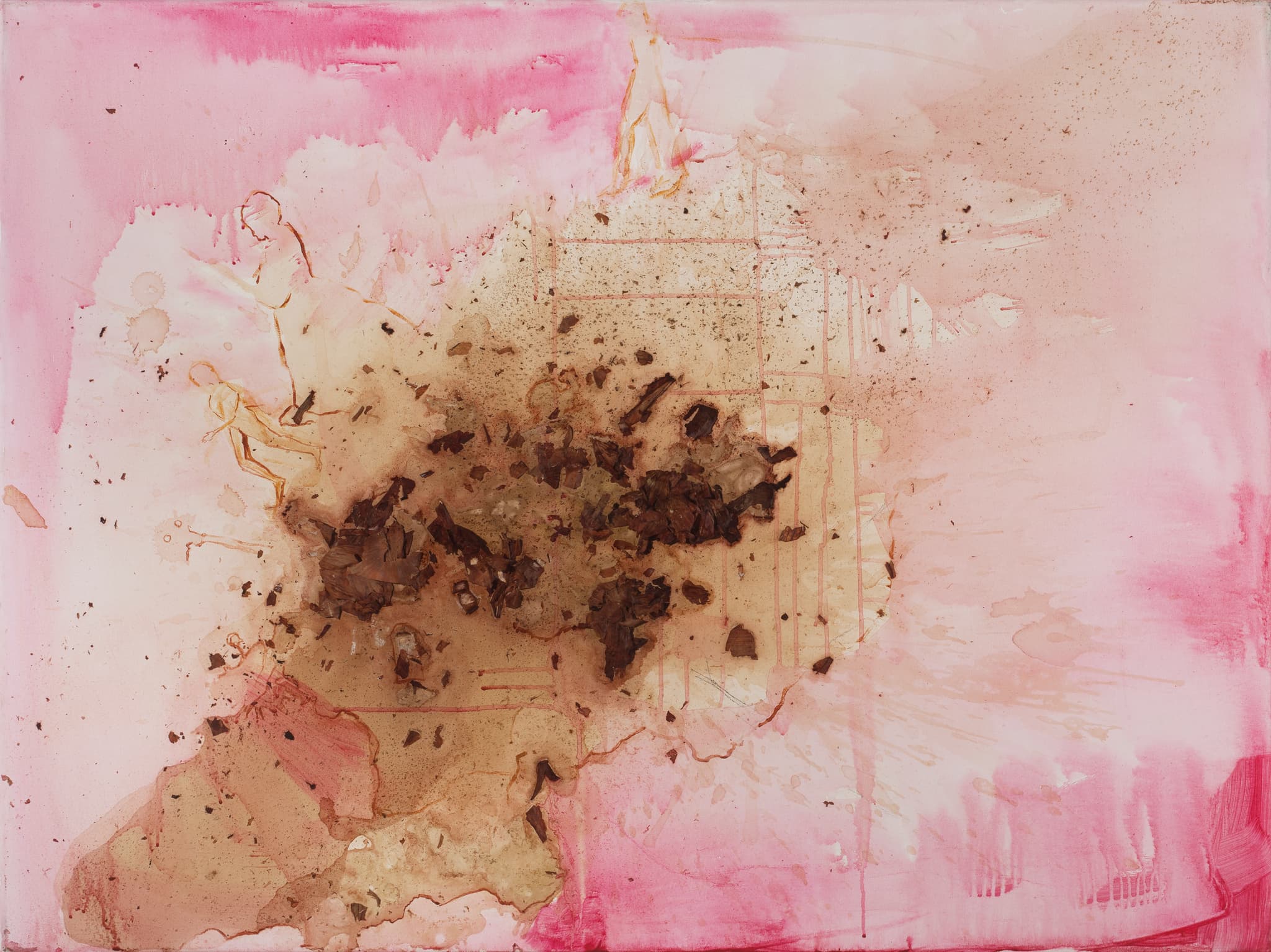 Marsha Nouritza Odabashian, Empire, 2019. Onionskins, Onionskin Dye, Drawing Media and Acrylic Paint on Canvas, 36” x 48.” Photo by Will Howcroft.