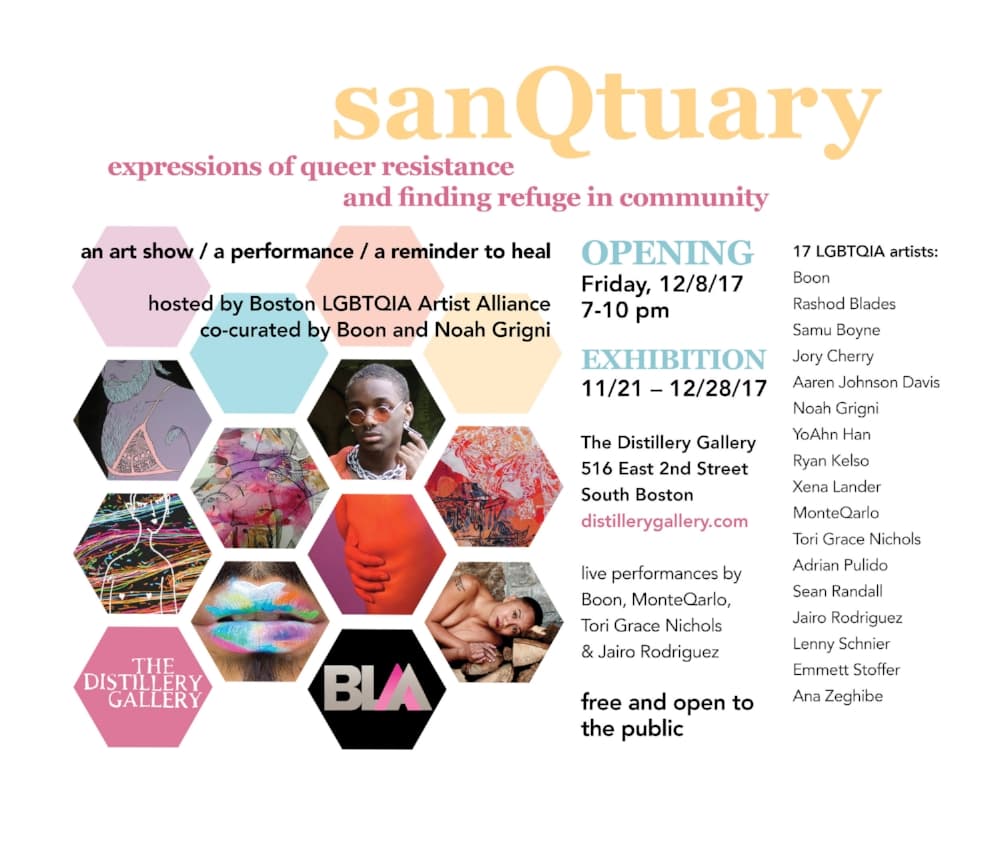 Let’s be real: the phrase “personal is political” is truth. That is, personal experiences are the threads that weave directly into greater social and political structures. For many LGBTQIA people, though, the emotional weight of a constantly politicized and/or silenced existence is a pressure that seldom receives an outlet. At the Distillery Gallery in South Boston, Boston LGBTQIA Artist’s Alliance and featured artists Noah Grigni and presented “SanQtuary”. Featuring 17 local and national multidisciplinary artists, SanQtuary provided a safe space for a variety of works by artists of all genders, sexualities, races, and ethnicities to coexist, let their guard down, and celebrate the strength of the LGBTQIA community through art and performance.