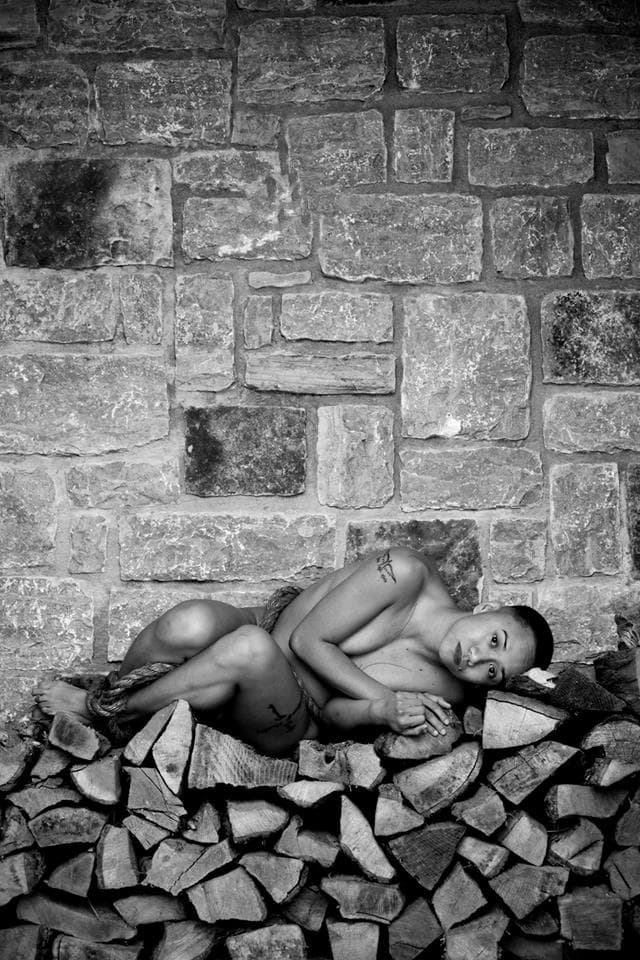 While some artists chose to represent queer experiences through drawing or sculpture, photographer Sean Randall chose to immortalize his through captured images. In a collection of photographs featuring poet, performer, and activist Tori Grace Nichols, Sean highlighted the complex intersections of vulnerability, resilience, and sexuality in queerness. His images documented Nichols in a variety of settings and poses, from boxing in a gym to naked and tied up in rope. One image, , was particularly evocative. Featuring Nichols naked and looking arrestingly at the camera on top of a bundle of wood, the photograph had undeniable gravity; however, an accompanying statement from Nichols transcribed the expression written on their face to words: