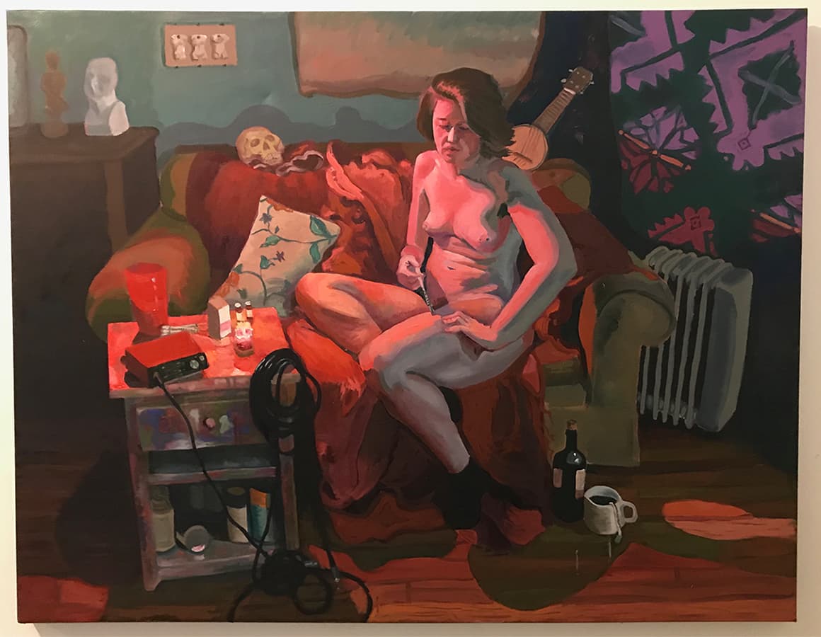 It is difficult to name a group of people whose bodies are more inherently politicized than those of trans folks. The reality of cross-sex hormone therapy for gender confirmation is frequently ignored, forgotten, or mystified as our society wrongfully regards this process as a one-time anatomical surgery. Jory Cherry, however, paints the unceremonious reality of hormone therapy abundantly clearly with their painting T(ea) Tuesdays. The self-portrait features Cherry bathed in pink light with the set-up for their treatment that Tuesday, sitting naked and upright on a couch with a needle in their left thigh, an open bottle of wine, and a cup of tea steeping at their feet. Such an image evokes common experiences of apartment life, which in turn reaffirms the necessary normality of the routine for this individual – and how it should be perceived as normal by the viewer.