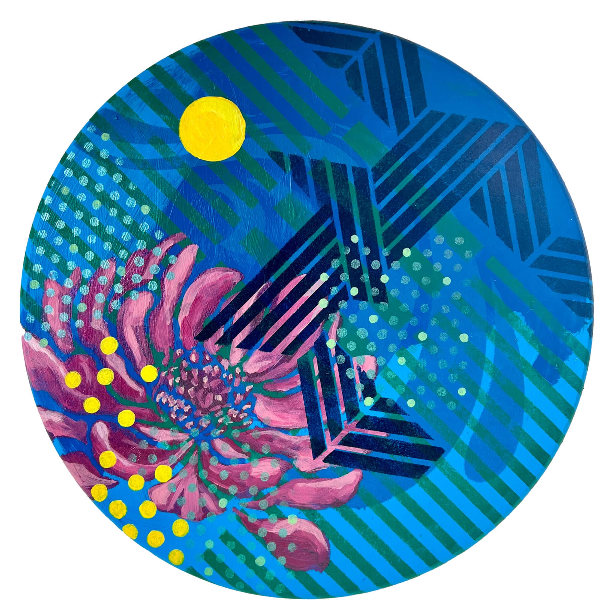 An abstract painting by Sneha Shrestha featuring bold orange and blue colors.
