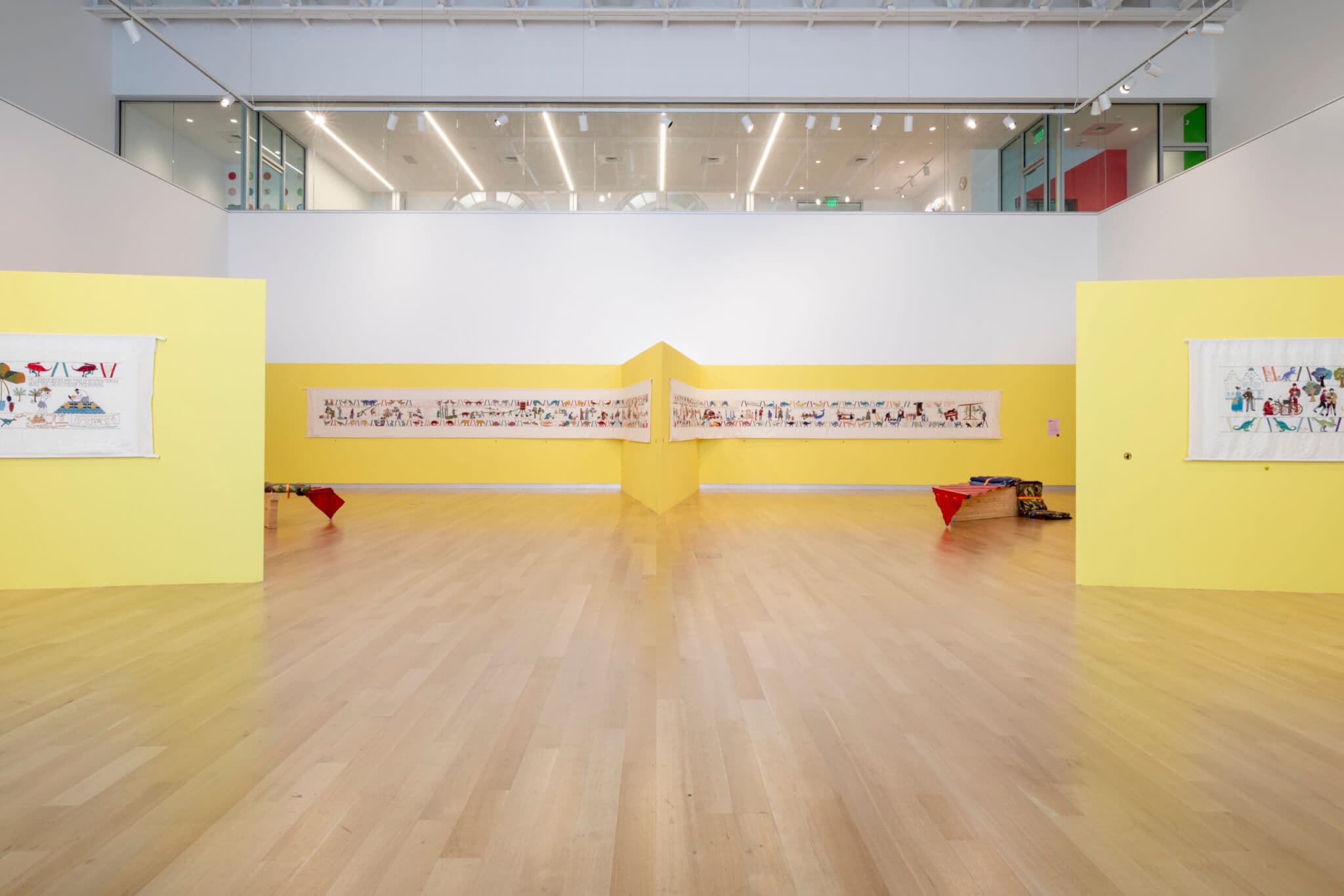 A long embroidered tapestry adorns a gallery wall.