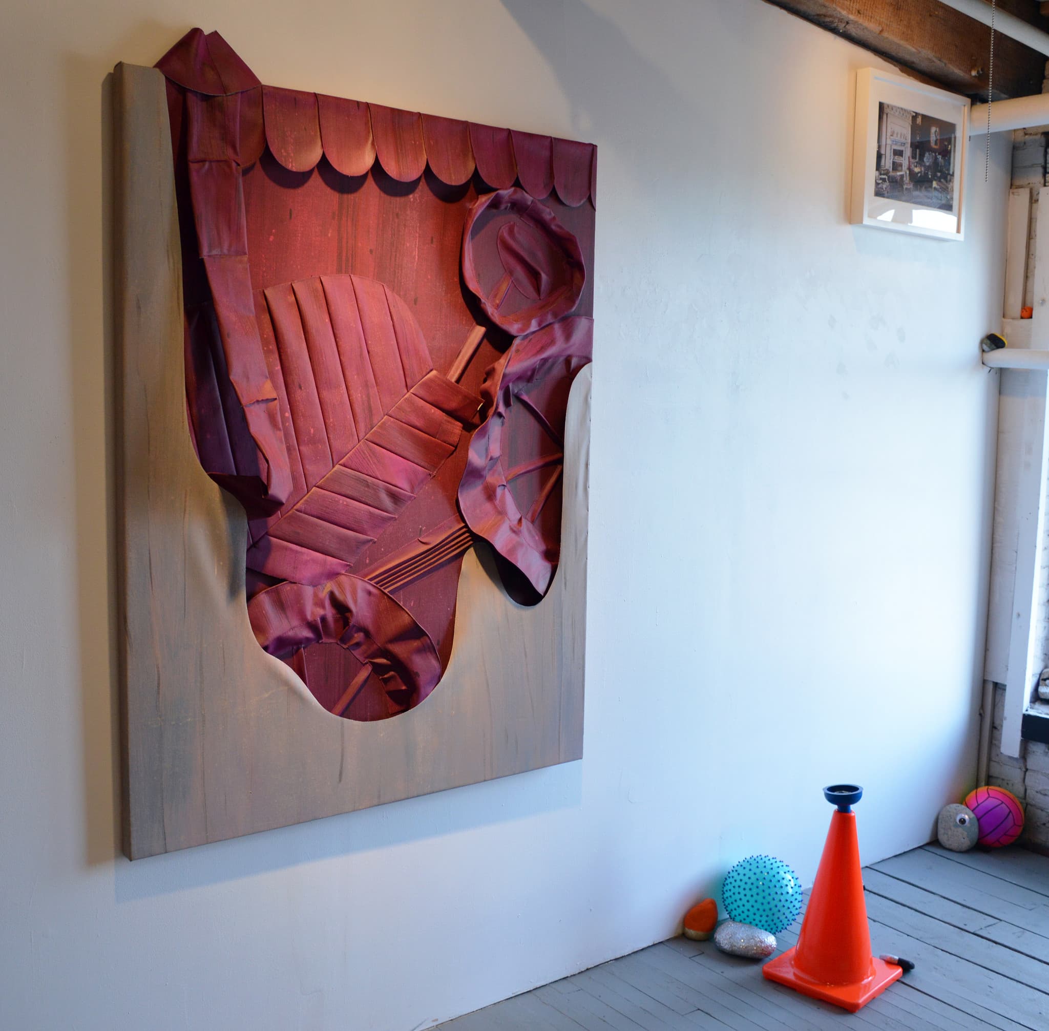 Of particular interest were sculptural works by Audrey Hsia, of Samsøn gallery. A multi-hyphenate, Hsia’s practice includes painting, collage, monoprints, and photography—often upending form and revealing new dimensions in each medium. Hsia’s work includes such everyday materials that a few visitors accidentally sat on one of her sculptural pieces, causing the work to nearly fall out of an open window. After a few visitors gasped, it was quickly revealed that nothing was damaged.