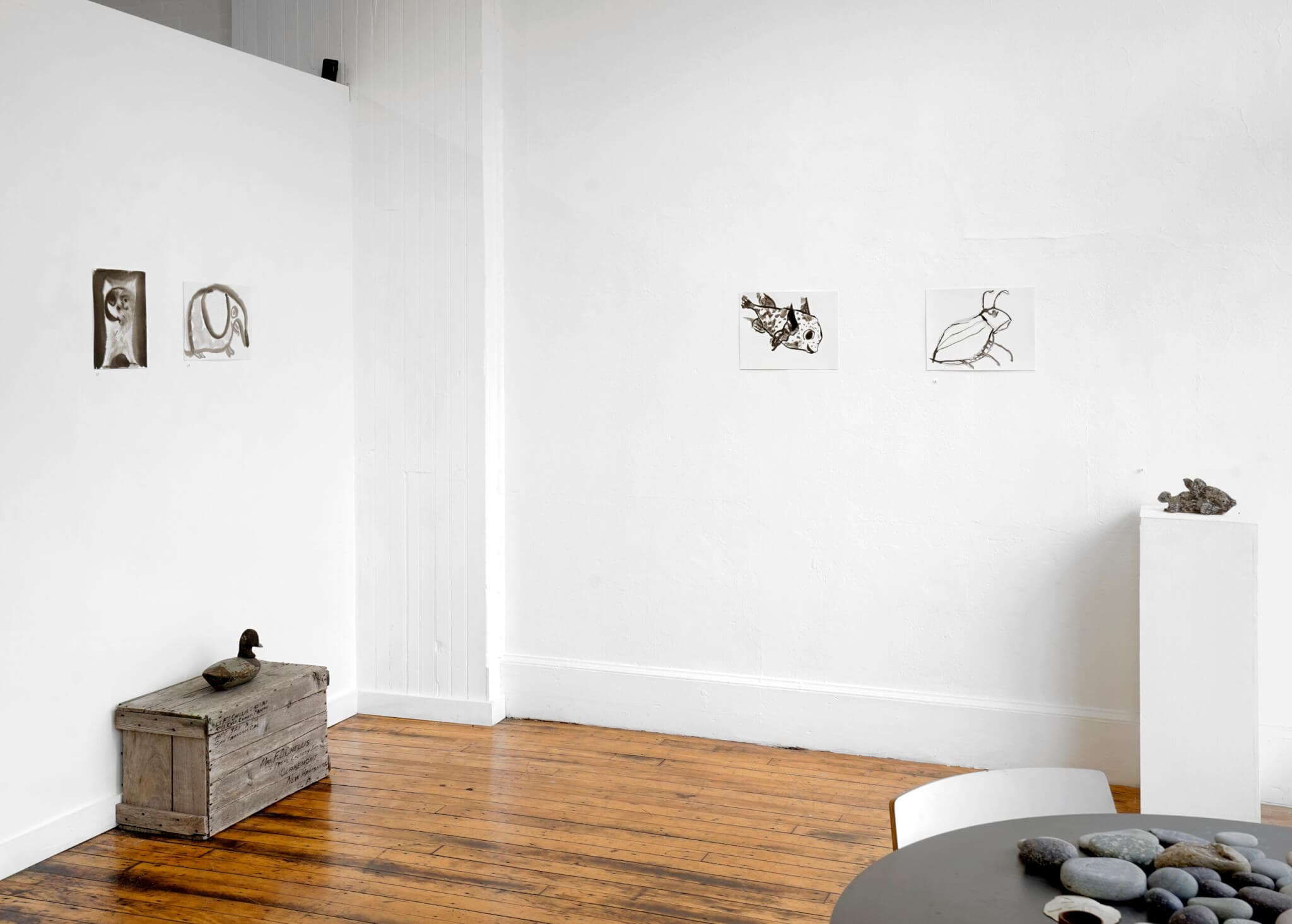 A majority of his twenty-three ceramic figurines are displayed in the larger, main gallery alongside all of Deszö’s works. The figurines reflect the same playful approach to process as the ink drawings and are clearly made by the same hand. Blue Forest Creature (2022) and Resting Being (2022) are clear companions to the works on paper with similar shapes and profiles. Wild Kiln Beast (2024), a ceramic sculpture less than nine inches tall, is a nice moment of visible connection with Dezsö’s ink and watercolor works, as the depicted creature looks like it walked right out of one of her paintings. Other figurines, such as Twisting Sea Form (2021) and Soft Being (2024), feel independent of the drawings, less articulate and more abstracted like an idea that hasn’t yet fully emerged.