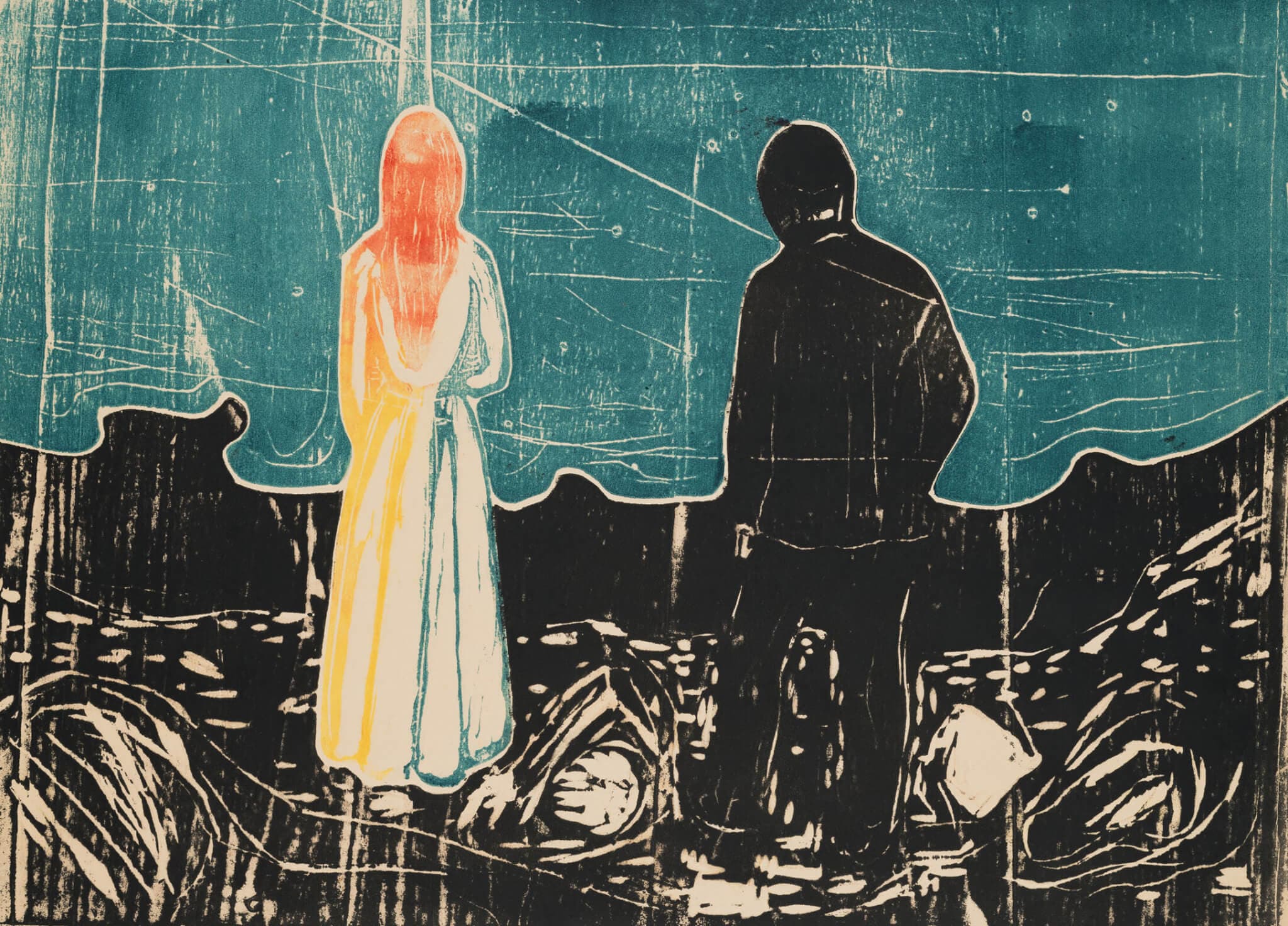 Edvard Munch, Two Human Beings (The Lonely Ones), 1894. Etching and drypoint printed in black ink on white wove paper. Harvard Art Museums/Fogg Museum, The Philip and Lynn Straus Collection, 2023.559. Photo: © President and Fellows of Harvard College. Courtesy of the Harvard Art Museums.