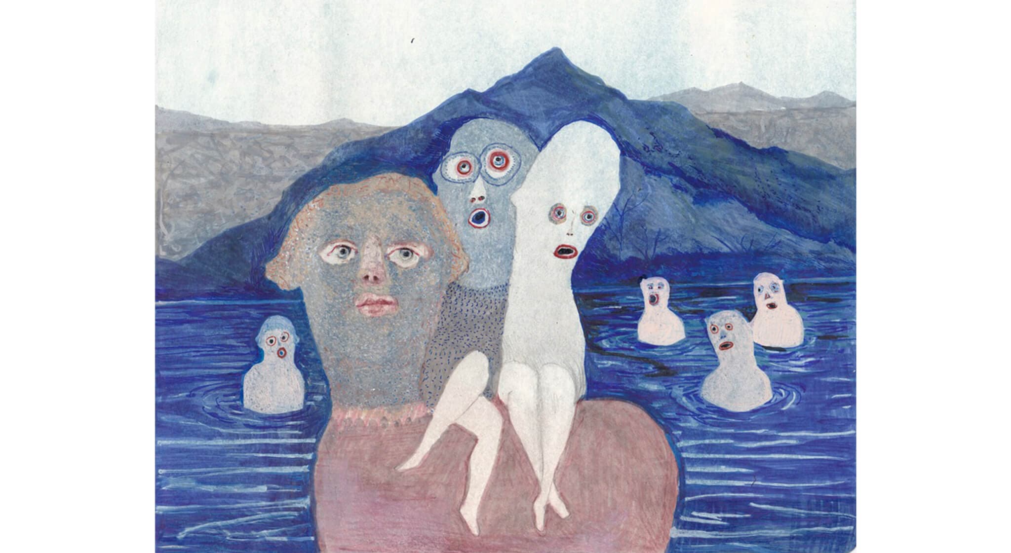 In contrast, Moore’s intricate, delicate sketchbook illustrations beckon us closer, inviting us to peer into the world of creatures and landscapes that look right out of a dream. The fact that they came out of her sketchbook—perforated edges and all—gives these drawings a magically intimate quality, as if we are peering into the artist’s mind. Moore, a middle school teacher familiar with the tumultuous emotions accompanying early teenage years, illustrates creatures that exude dread, joy, confusion, and that unique self-awareness that comes with inching toward adulthood. Figures like those in One way or another (2021) or Protect (2023) are charming little hybrids, humanoid but not fully identifiable. Works like 8 (2021) and 9 (2022) are reminiscent of some of Moore’s portraits from years past, which walked the line between endearing and unsettling. It’s a wonder Moore can fit such complexity onto paper often no larger than an average notebook.