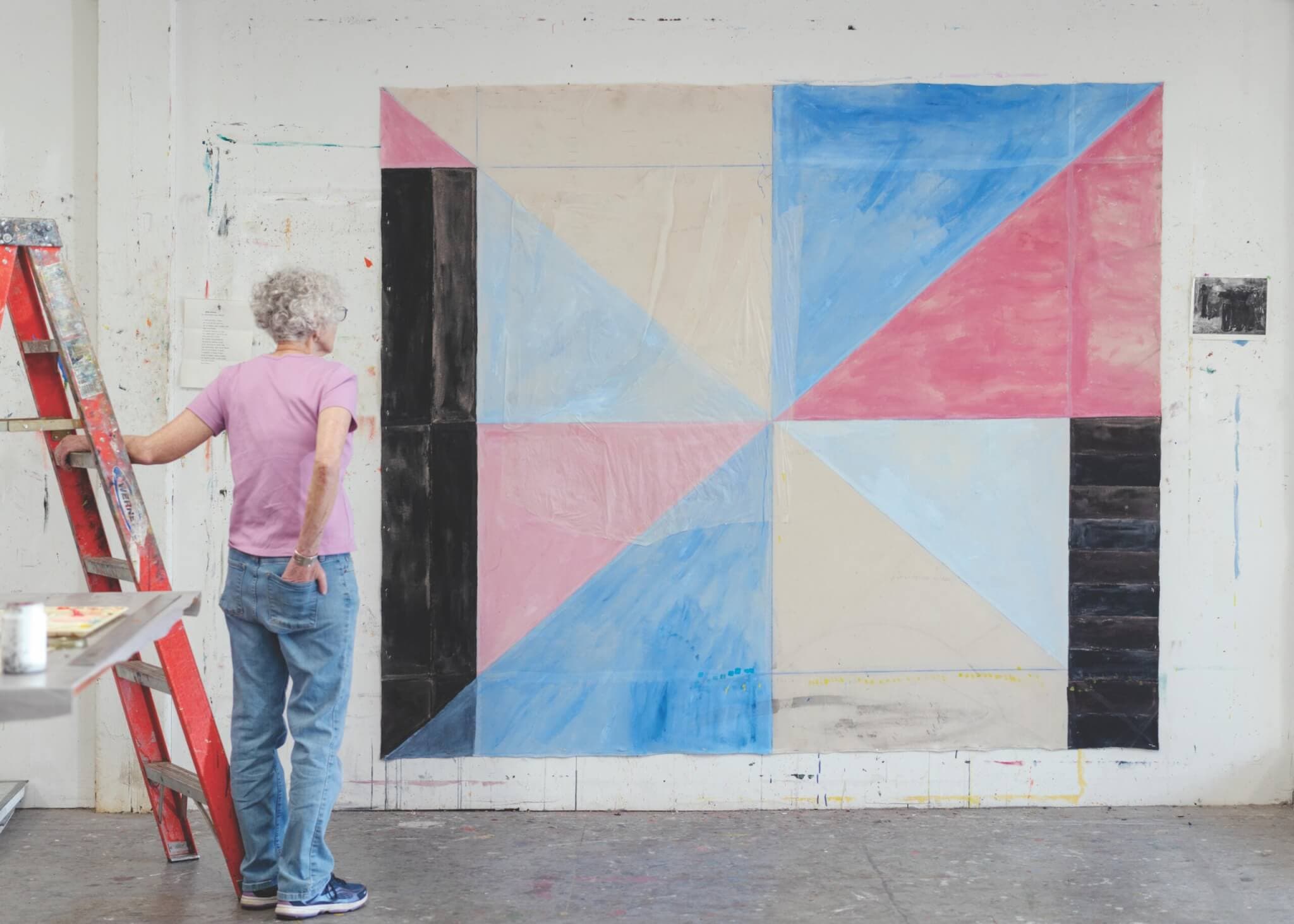 JAR: I’ve been working on a big unstretched canvas that is the continuation of an idea I had in 1973. For years, I didn’t know how to make it happen. I kept a half-finished oil painting that was huge. And finally, I threw it out. I’m interested in regularity being interrupted by irregularity, and one of the shapes I’d thought about was a pinwheel coming together in the center with alternating colors. I tried it in oil—it was a mess. Recently, I made an eight-foot square and found the center with a chalk line and divided those quadrants in two and then felt free to improvise in a way that I hadn’t when I was younger. It was just fun to work on. Still, as I was fifty years ago, I was interested in the limits of vision in terms of what you can see, one black to another and one white to another.
