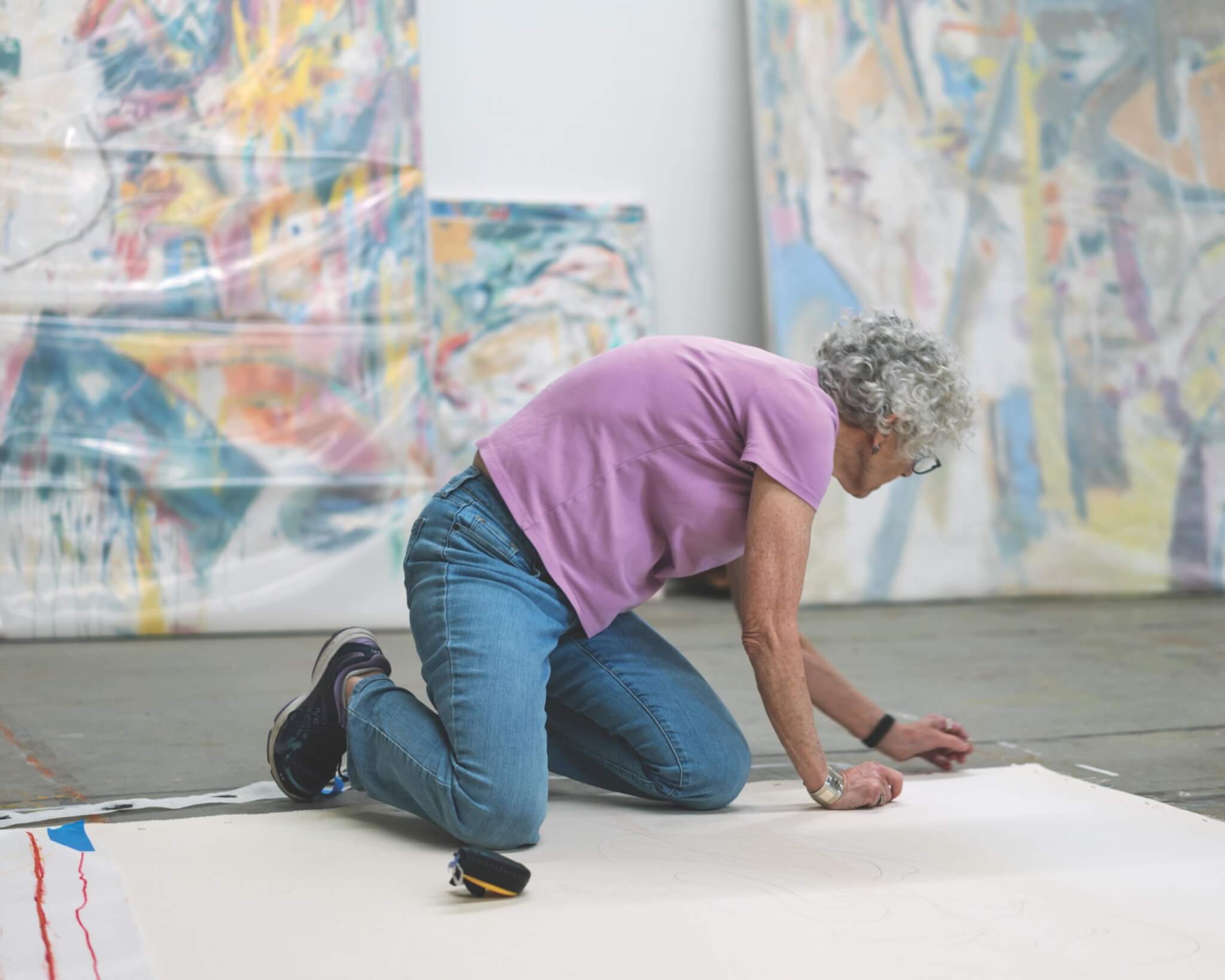 Jo Ann Rothschild is a painter in the sixth decade of a career that began in her time as a student at Bennington College and deepened during years in Western Massachusetts in her early twenties. She arrived in Boston for graduate work at the Museum School and, in 1993, was the first recipient of the Maud Morgan Prize, given by the Museum of Fine Arts to an outstanding female artist in the city. Thirty years later, her airy fourth floor studio on Albany Street in the South End is packed with canvases of all sizes, on which she explores her medium through an expressive, abstract, and often hermetic vocabulary of marks.
