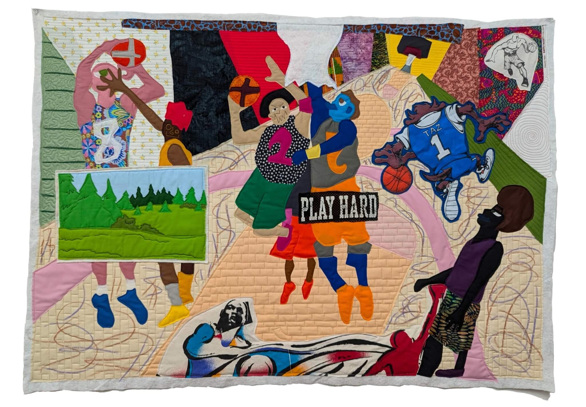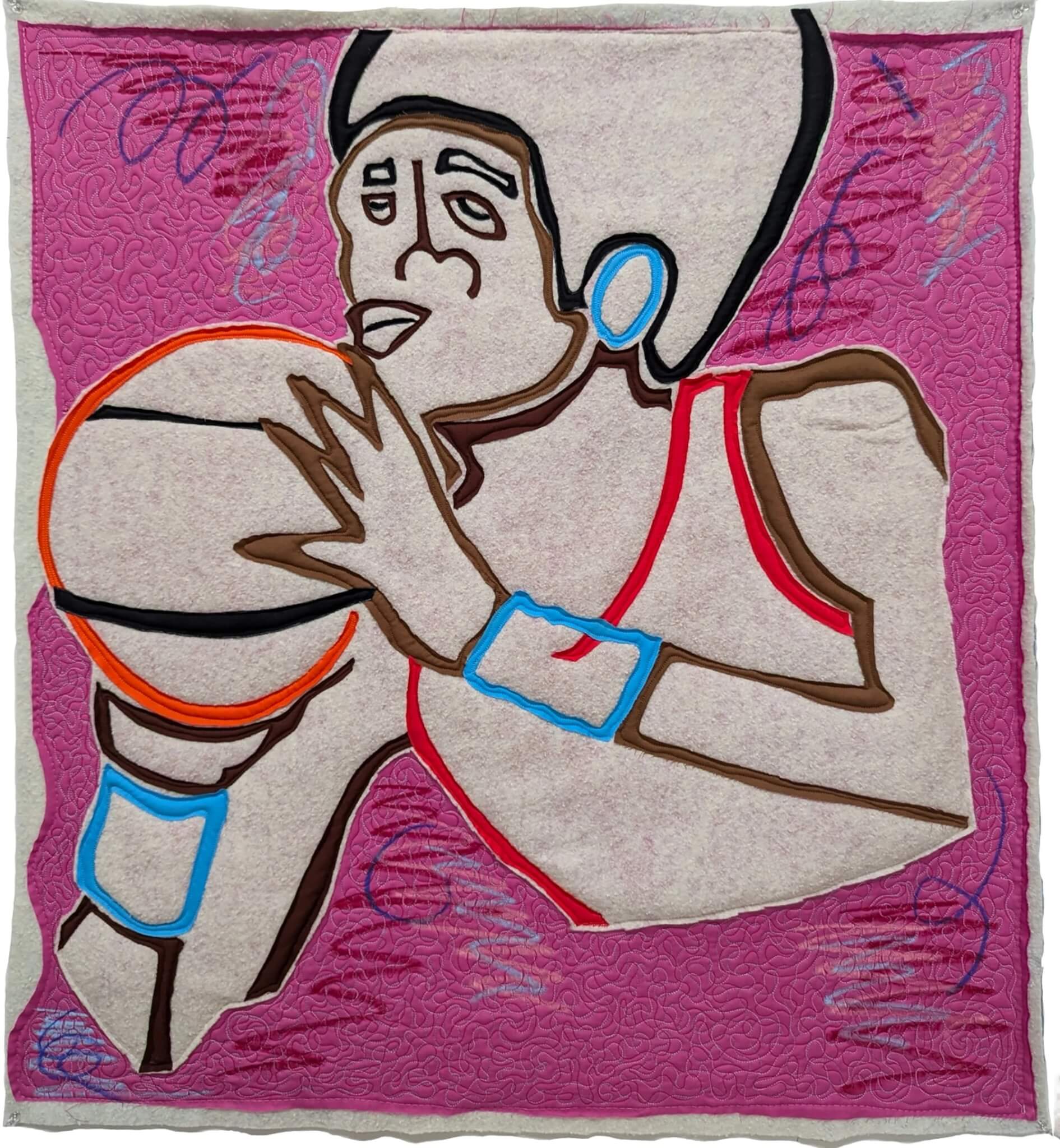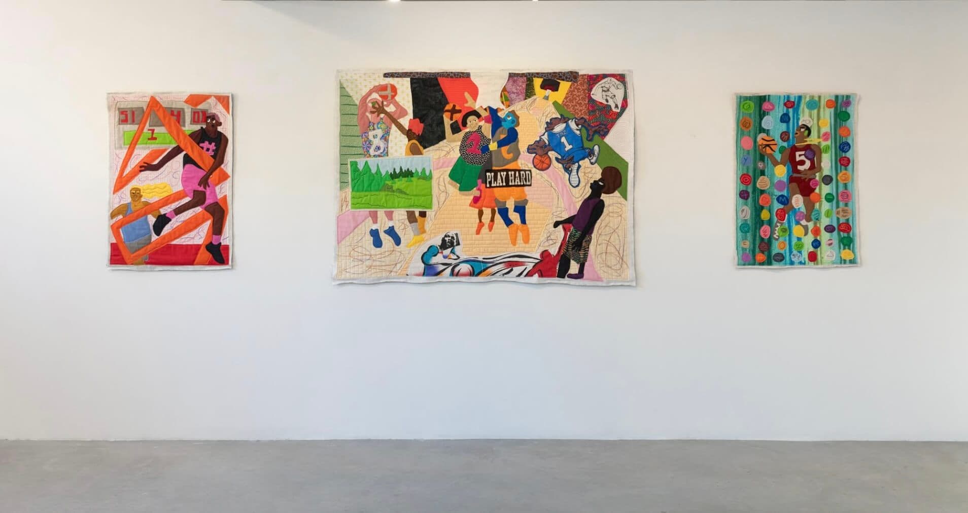 Basketball is a sport of equal and opposite forces, swift actions met by harsh and instinctive reactions. Hoops springboard in and out of place, basketballs bounce off surfaces, and team formations are constantly disrupted by the other team’s intentions. Artist Michael C. Thorpe’s new exhibition, “Barstool Sports,” running through October 27 at LaiSun Keane, is a collection of intricately sewn quilts depicting athletes caught in this precarious relationship. The technicolor quilts depict basketball players in poses otherwise conventional if not for Thorpe’s distinctive practice which employs crudely cut out swatches of colored fabric layered and sewn together with a quilting machine to create flattened cartoon-esque scenes. The edges of Thorpe’s quilts are left unfinished—batting and dangling threads are visible where there would otherwise be a tidy border. The outcomes are undeniably quilts, but quilts filtered through a style that when not abandoning tradition, distorts it.