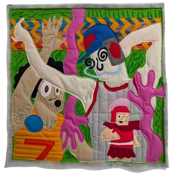Ham Going Crusty, 2024. Fabric, batting, thread, crayon, 35.5” x 32.5”. Ph0to by Dan Watkins. Courtesy of LaiSun Keane.