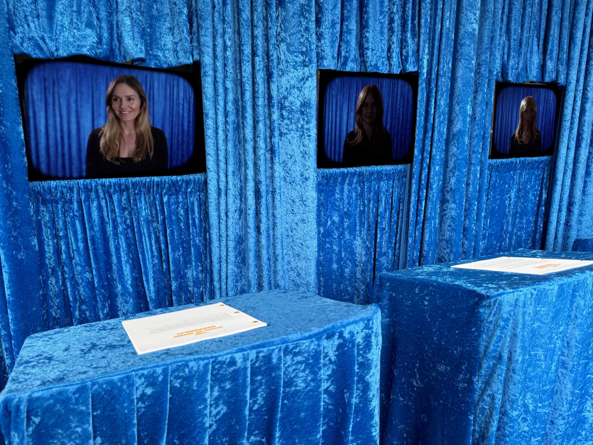 Elizabeth Withstandley’s “The State of Being Indivisible (I want a perfect soul)” glows through the windows of Brookline Arts Center’s gallery, awash in blue. Withstandley uses Jeopardy! (and its characteristic blue palette) as a vehicle to explore the multifaceted nature of personal identity through a combination of video, audio, and installation. A forty-two-channel composite video that aggregates contestant Amy Schneider’s historic streak on the game show from 2021 to 2022 is the basis for which Withstandley builds the remainder of the exhibition around.