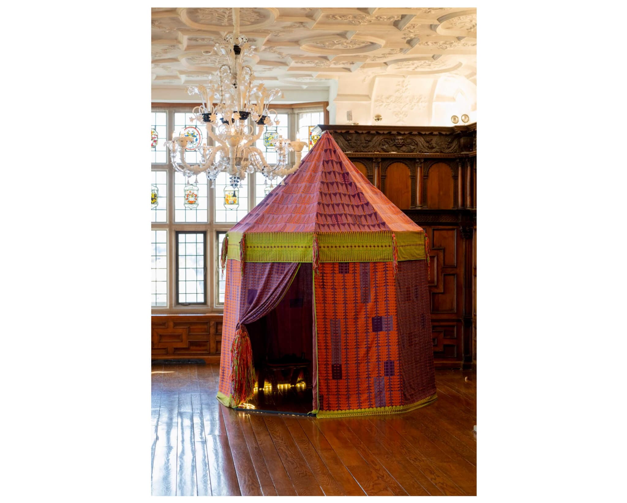When you enter “Swapnaa Tamhane: Spaces That Hold,” curated by Siddhartha V. Shah and on view at the Mead Art Museum, you are invited into a space, a structure, a place. The implied fabric structure is constructed from multiple suspended ajrakh textiles—long yardages of block-printed fabric featuring geometric patterns and natural dyes. The form of the shape created via the fabric itself evokes the domestic, with its pointed roof and allusions to rooms or room dividers, yet it transcends the home through the austere nature of the space and the quietude of the museum, suggesting instead a sacred environment.