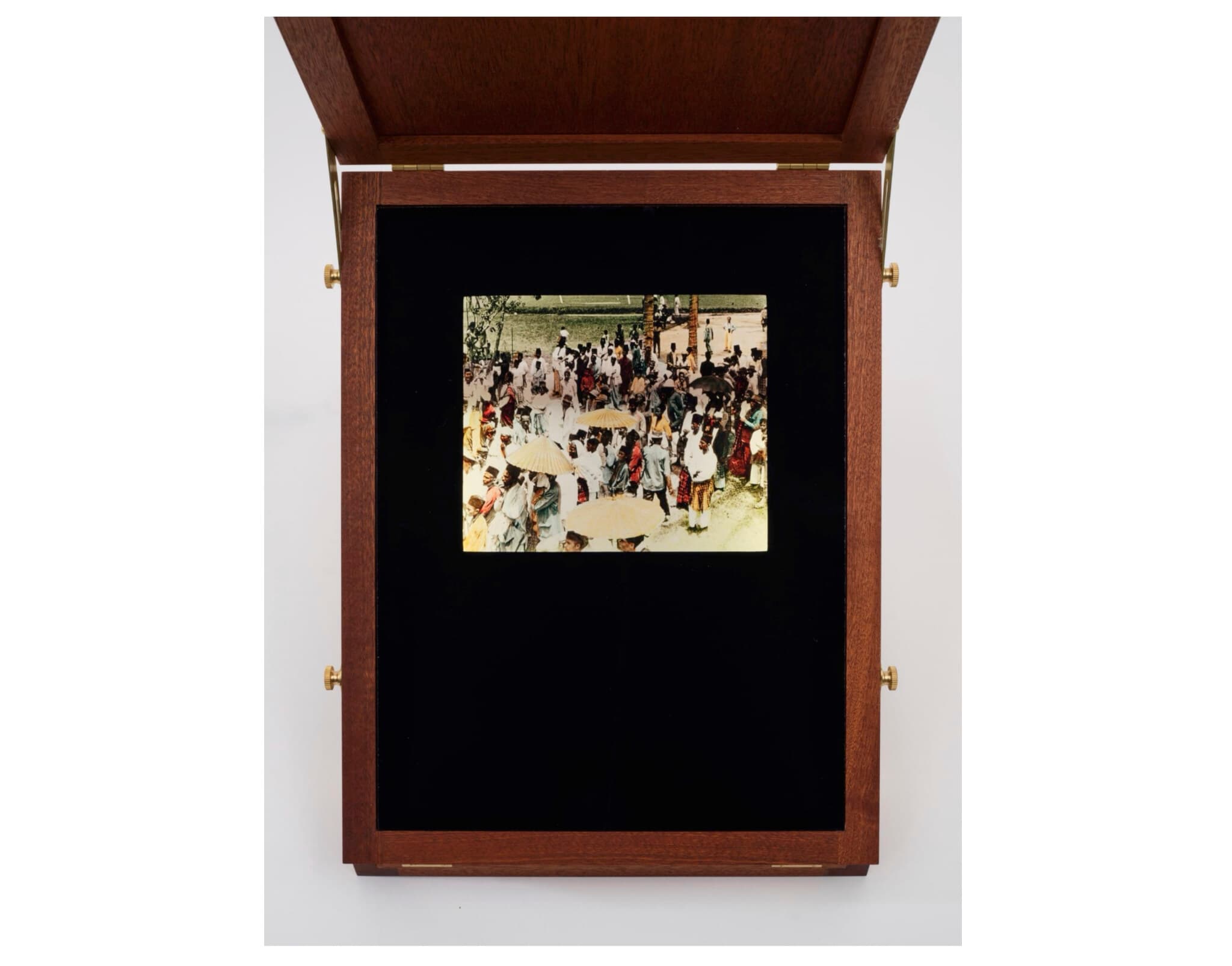 Sim Chi Yin, The Suitcase Is A Little Bit Rotten, Crowd, 2022. UV print on glass, light box, replica vintage stand. Glass plate: 30.5 x 23 cm (stand: 33.5 x 26.3 x 60 cm). Photo by South Ho. Courtesy of Hood Museum of Art, Dartmouth.