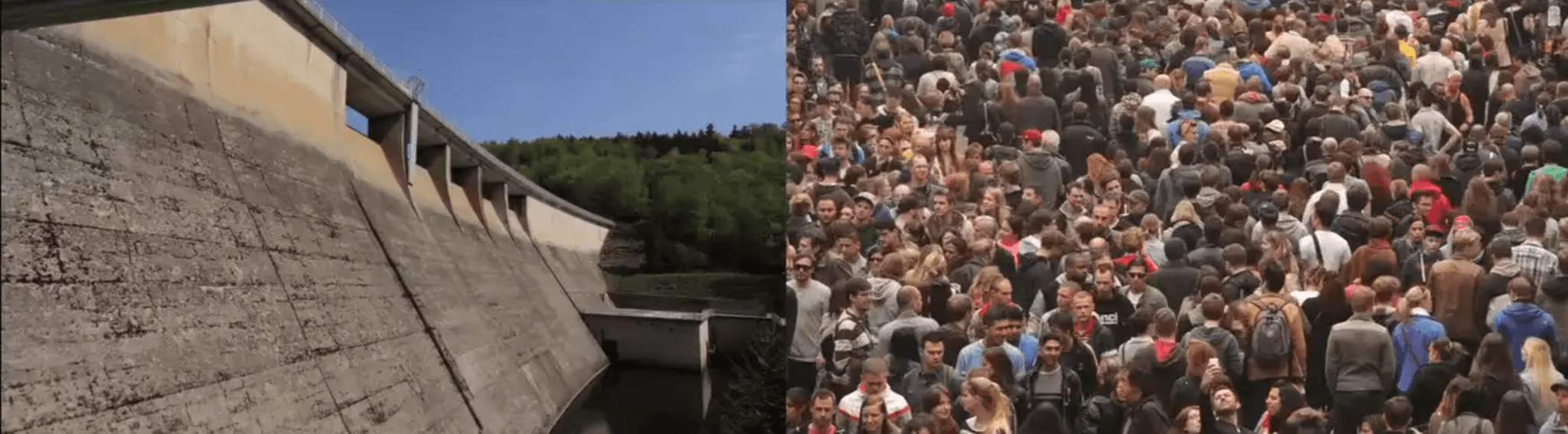 In Carolina Caycedo’s Spaniards Named Her Magdalena, But Natives Call Her Yuma (2013), the English-Columbian artist presents a diptych-style video installation of the main river that runs through Columbia, the Yuma. In one screen, the artist presents footage of the Yuma and the El Quimbo dam. On the right, she shows people from the region. In crowds, slowly moving as a mass, their bodies fill the entire screen. Yet at times, fishermen, families, and community members are shown interacting with the river as a lifeblood on an individual, even intimate level. The artist conducted a series of interviews with artist, architects, researchers, and community members who are being directly affected by the development of the El Quimbo dam; a project that is being conducted by a transnational corporation. In an interview with Pilar Tompkins Rivas, Caycedo shared that, “Six towns in the local county subdivision of Huila are directly affected by El Quimbo, and approximately 3000 people will be displaced through its construction.” The contrast presented between the two screens illuminates the relationship between people from the region, while also highlighting the potential damage unaffected multinational corporations have the potential to wreak on a community.