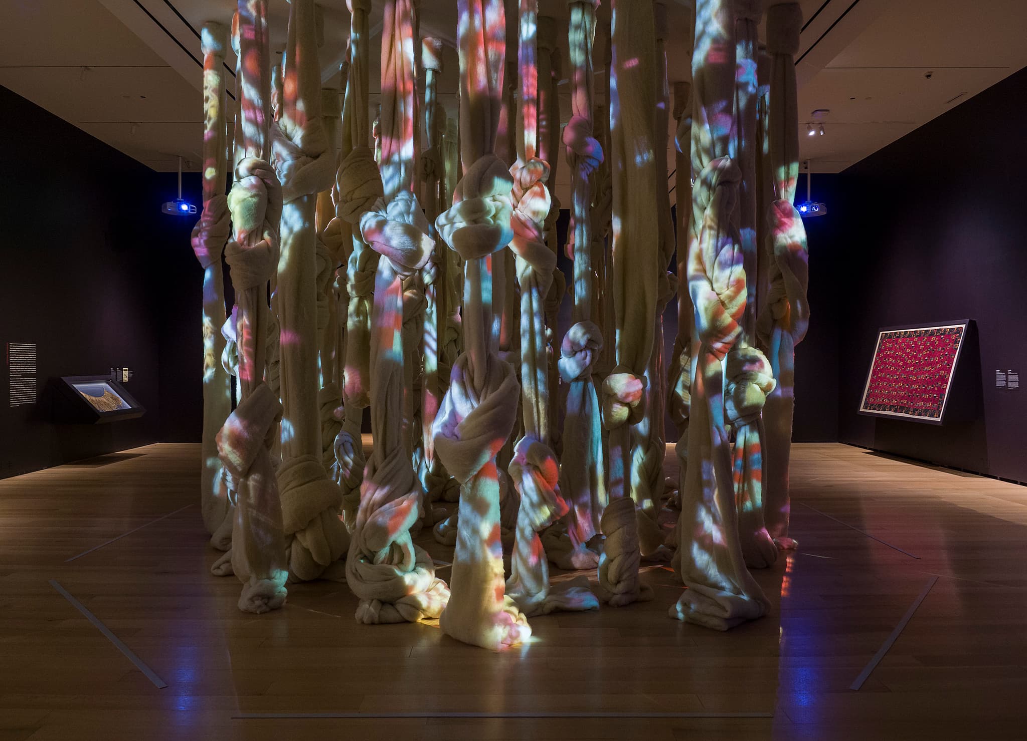 On the occasion of Vicuña’s exhibition at the Museum of Fine Arts, Boston, “Disappeared Quipu,” the artist created a site-specific, large-scale installation that stood alongside five historical quipus from the Peabody Museum of Archaeology and Ethnology at Harvard University. Using massive swaths of unspun wool, the quipu sculpture became a site for visual projections of textiles that Vicuña selected from the Andean collections at the Brooklyn Museum and the MFA.