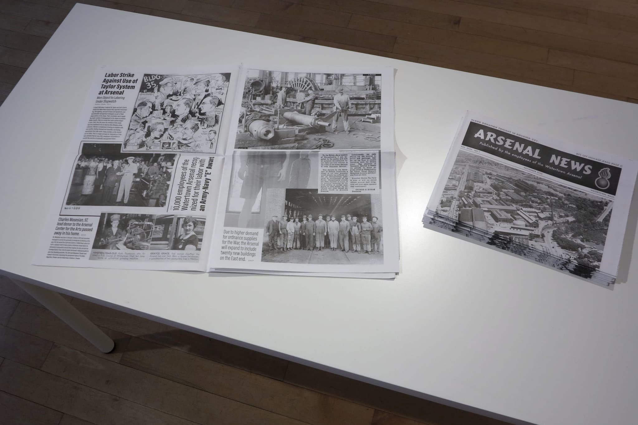In the main gallery, copies of Arsenal News are available for visitors to take home. This newspaper, which is also available around Watertown Arsenal Yards, is Zakari’s reimagining of a now-defunct biweekly publication for the Arsenal workers. The artist’s version is not a summary of the exhibition, but within its twelve pages, she has curated a perspective that focuses on the people and their labor, tracing this thread through to the present day. The work is a pastiche of past and present, using historic and contemporary photos and clippings of people and events from the Arsenal’s history. Like the video installation, the two interrupt each other, and the line between which informs the other is blurred.
