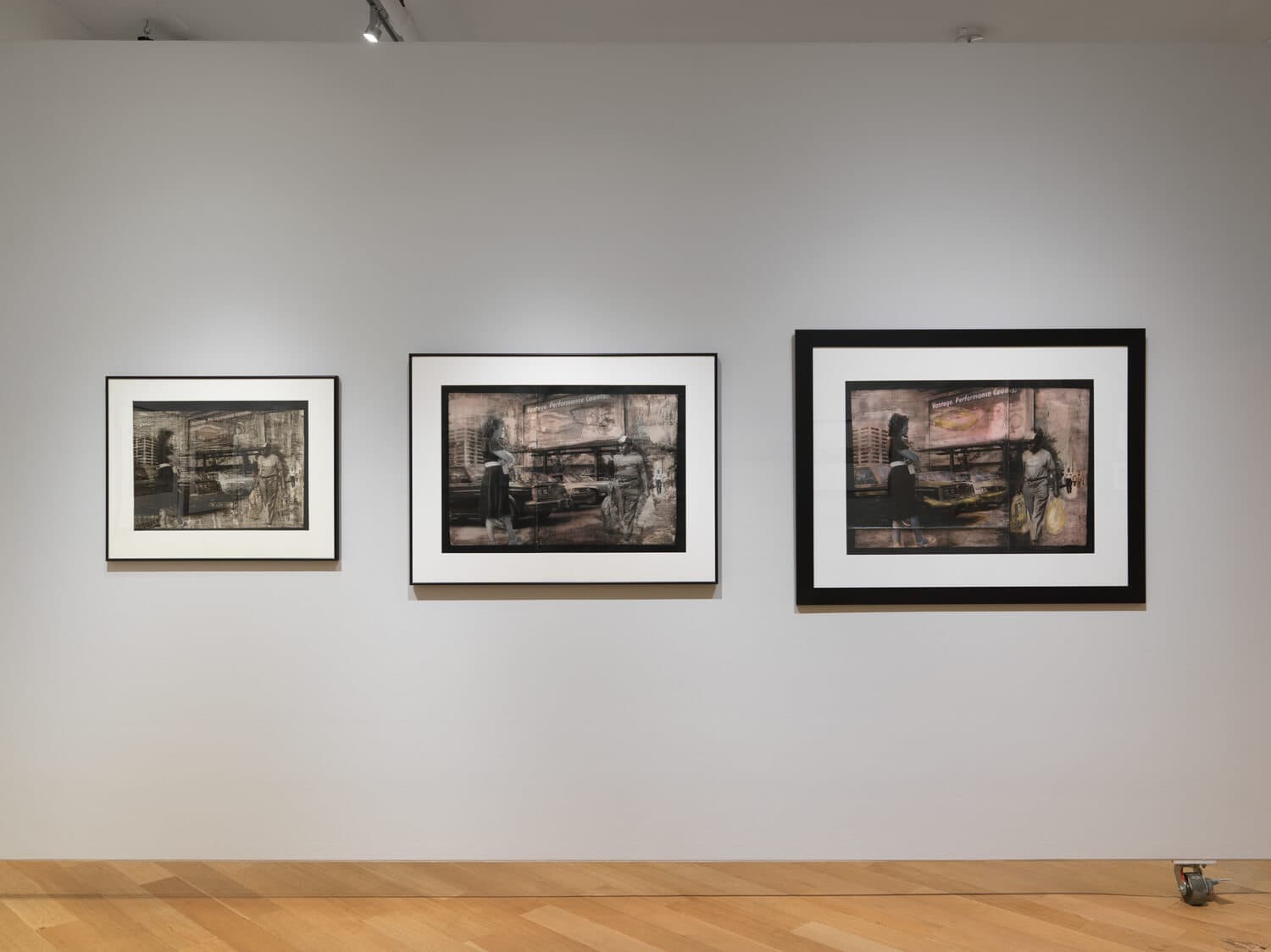 Christian Walker's photographs, some black and white, some blue toned, line the walls of a gallery.