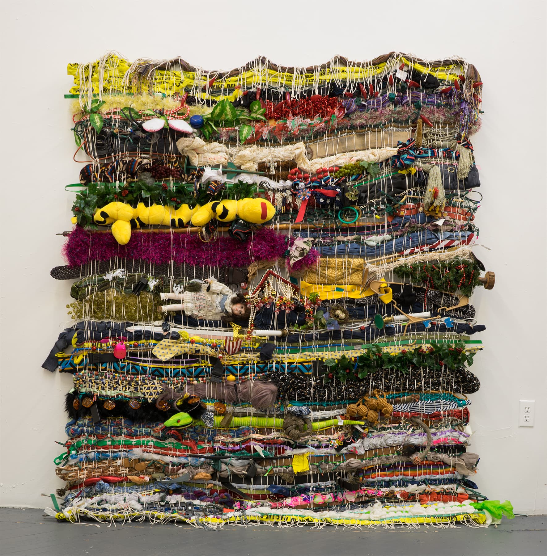 Created from months and months of accumulating and layering, Woomin Kim’s Urban Nest: Boston is a maximalist hanging textile, woven from fabrics and objects scavenged from Boston’s streets and thrift hubs such as Boomerangs, Cambridge Antique Market, Goodwill, and the city’s unofficial September 1 holiday, “Allston Christmas.” The work is a stratified archive of the lived experiences of the people of this city—a record of celebrations and holidays come and gone; of possessions lost and phases outgrown; of shifting relationships, identities, and realities. Viewing the work is to interweave your own memories and associations into it. In my interpretation, the work also reflects the transient reputation of this city, imbued with the rhythms of coming and going, discarding and discovering. Not only is Urban Nest literally made of Boston, but it also belongs to Boston: the work has been acquired into the art collection of Bunker Hill Community College, one of the few public educational institutions in the city that serves a decidedly hyperlocal population.