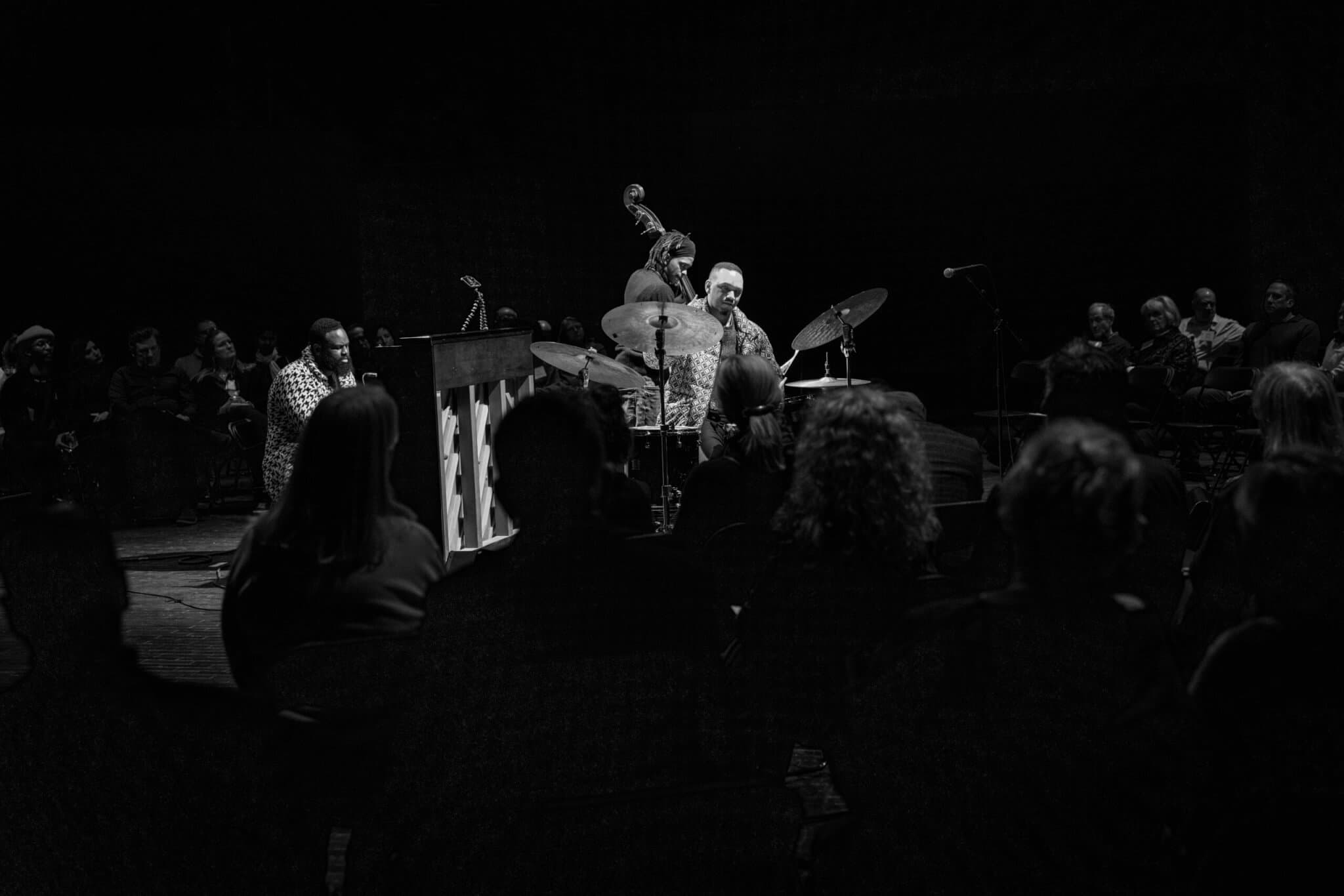 Trio James Francies, Jeremy Dutton, and Will Mabuza playing in “Deconstructed Anthems: Massachusetts” in the BCA Cyclorama. Photograph by Melissa Blackall.
