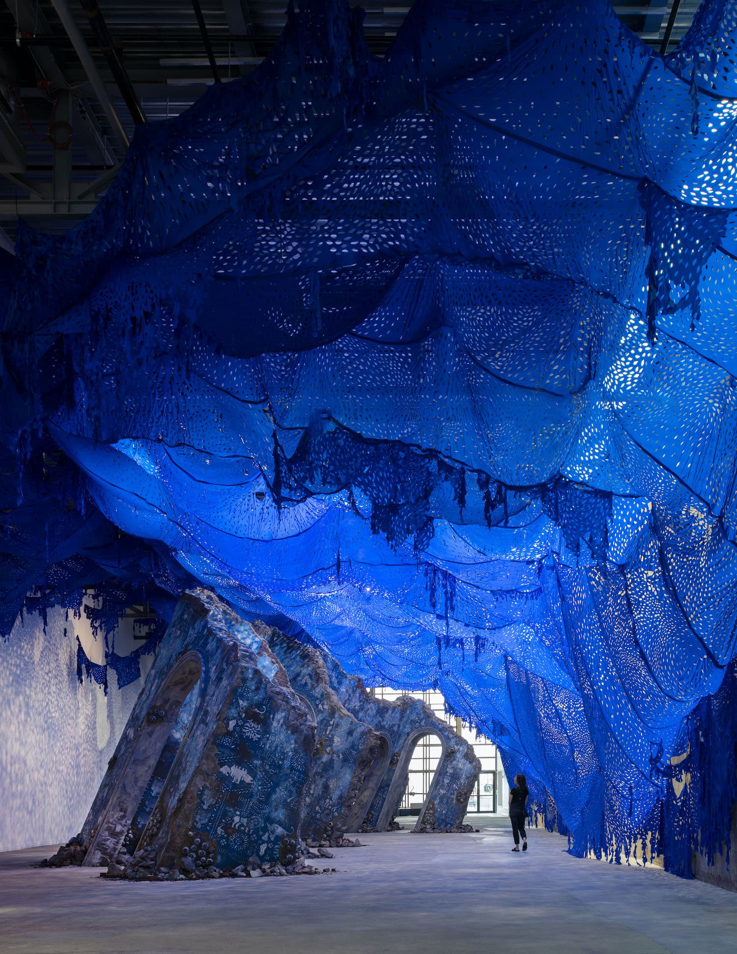 The reimagined Sans Souci emerges from the Watershed’s floor beneath a massive blue tarp with delicate cutouts for light, mimicking the play of light and water. Photo by Chuck Choi. © Firelei Báez