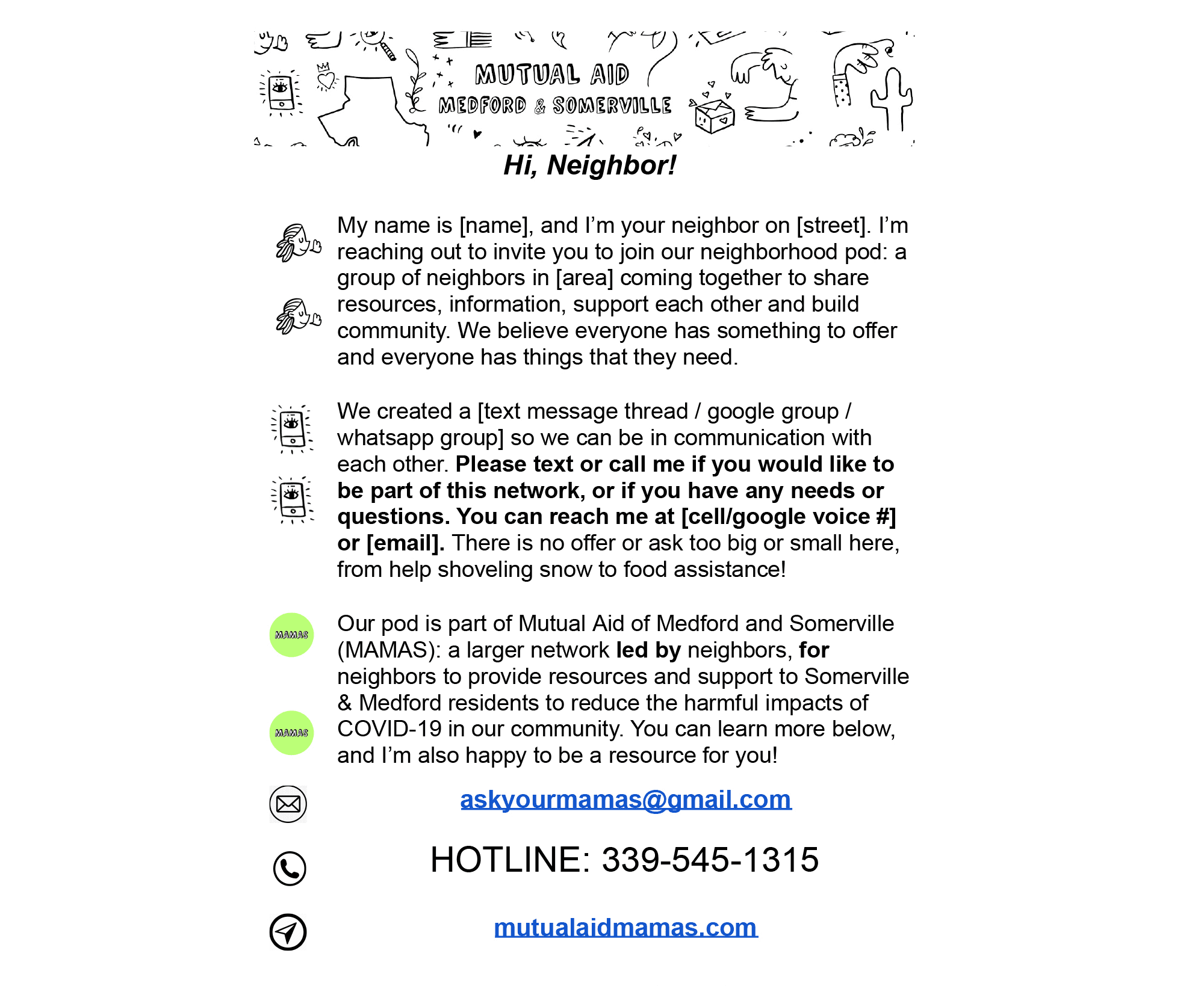 Template for neighborhood pod flyering, 2021. Created by MAMAS Neighborhood Pod Persons Coordinators working group. Courtesy Mark Anthony Hernandez Motaghy.
