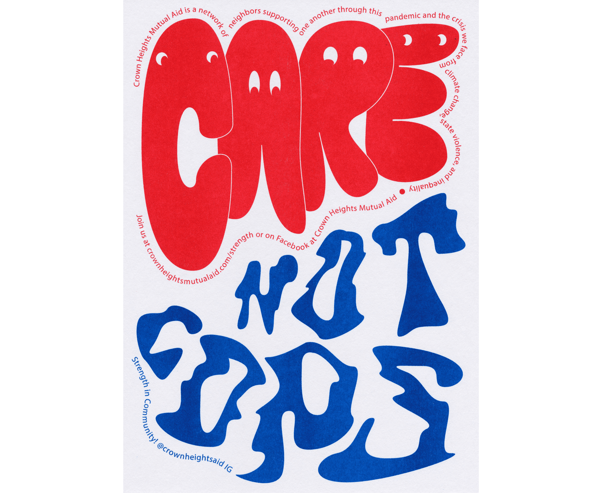 The poster design, for me, directly connects to the tone, form, and structure of the zine-book. For example, the word “Care” is spelled in a way where each letter is its own anthropomorphic character and, in a sense, has its own voice. That relates to the various voices transcribed in our publication and how we co-created this project. In contrast to “Care,” the typeface aesthetic for “Not Cops” tries to communicate how much of the work that CHMA is doing is necessitated by the violence and oppression carried out by police and the carceral apparatus. We thought of this poster as its own form of mutual aid, and we sold them and raised about a thousand dollars, which then went back into the community groceries.