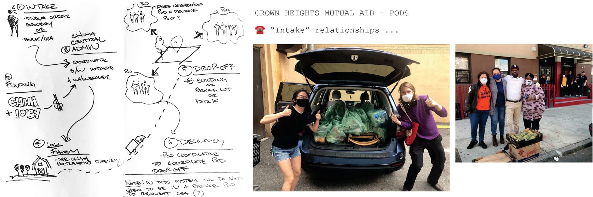 (left) Sketch for Crown Heights Mutual Aid plan for pods, 2020. Courtesy Mark Anthony Hernandez Motaghy. (right) Slide on the grocery intake process from CHMA’s Neighborhood pod-share presentation, 2021.Presented by Madeline Blount, Nedra Brown, and Amy Garapic from CHMA. Courtesy Mark Anthony Hernandez Motaghy.