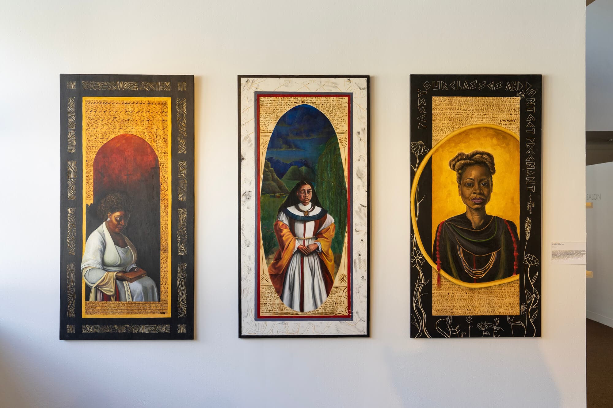 Across another wall of the gallery, a set of three large painted portraits are prominently displayed. Through My Mother’s Keeper (2023), Marla L. McLeod highlights the specificity of human experiences and belief systems. Each portrait portrays a maternal figure from McLeod’s personal life, and each figure has their own beliefs, cultures, and experiences of historical events visually demonstrated in the carvings around the portraits. When seen side by side, as they are intended to be, the set communicates a sense of power and influence, as they all had a role in shaping McLeod’s childhood.