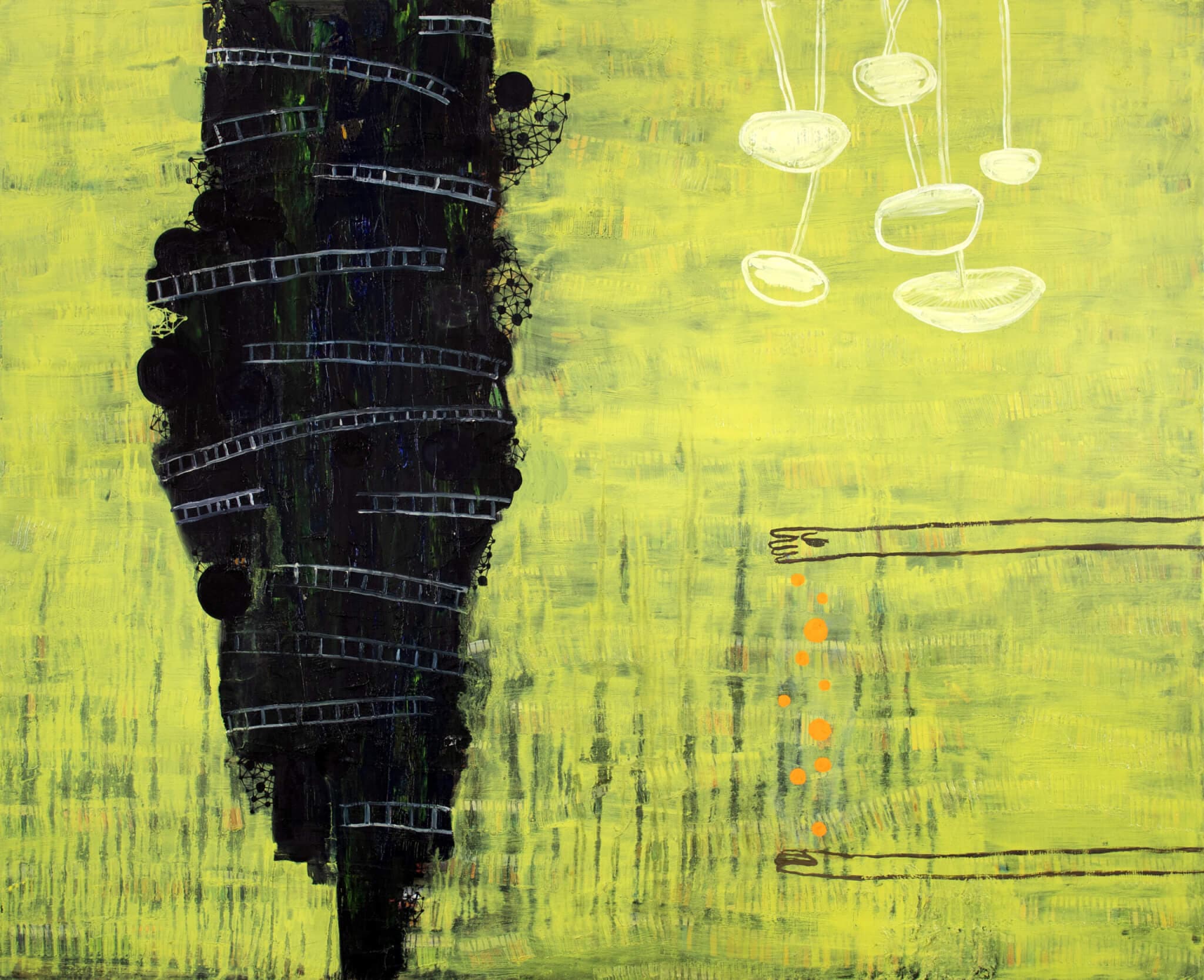 Eventualization (2023) is a storm of bright yellow-green converging over a winding dark mass. The mass contains sinking spheres, atomic shapes, and ladders bridged over itself. It bubbles and moves as a physical interpretation of chaos. Organic mushroom life-forms droop in from the upper right-hand corner. They hang above outstretched hands reaching toward the accumulation of dark matter. This piece is an origin story. Just as the title suggests, it evokes a sense of materialization. In contrast to the work to its side, which explores themes and concepts known to us, Eventualization accounts for the pre-existence of those ideas.