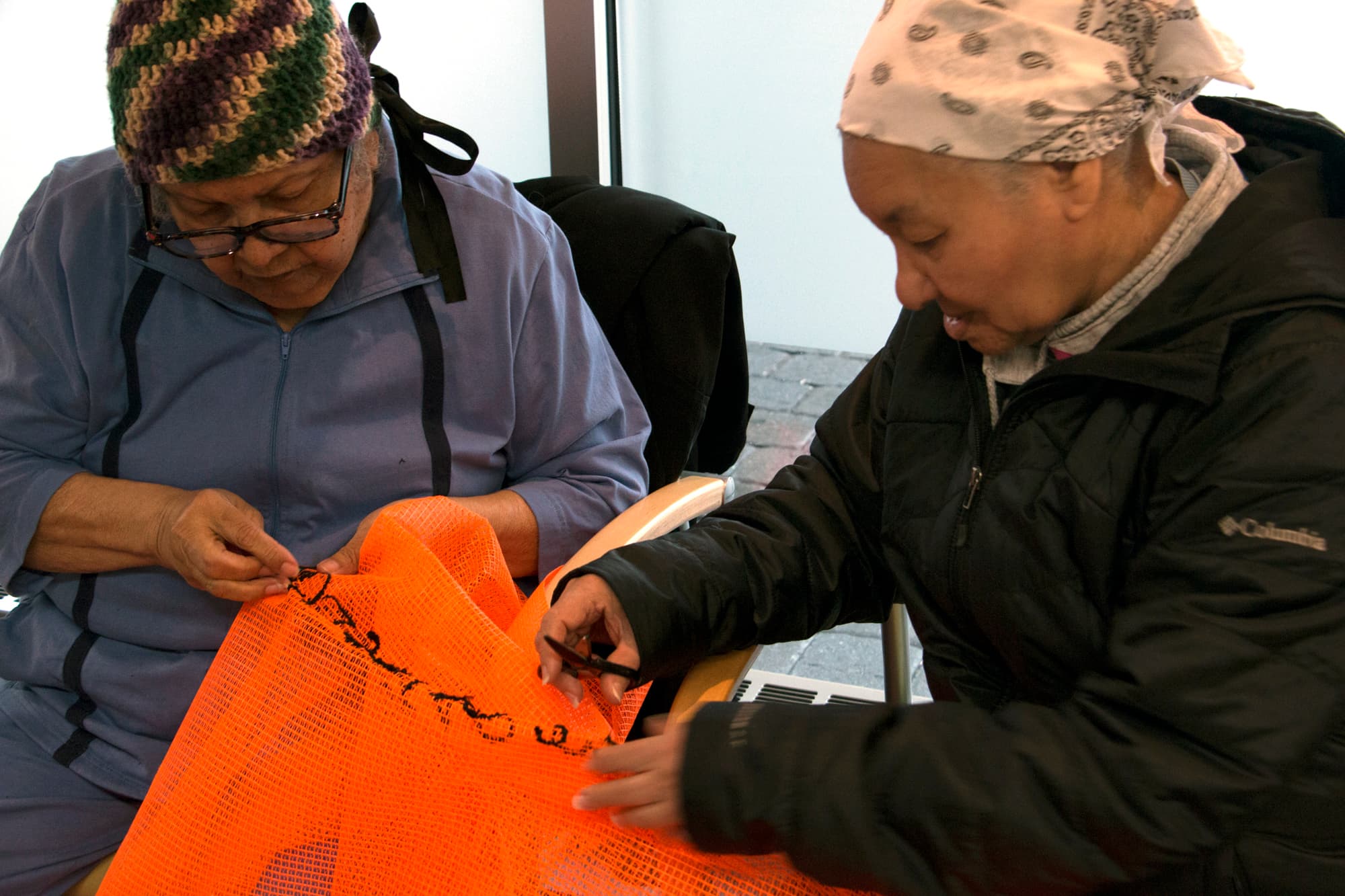 Members of IBA/La Villa Victoria participating in embroidering the netting. Image courtesy of the artist.