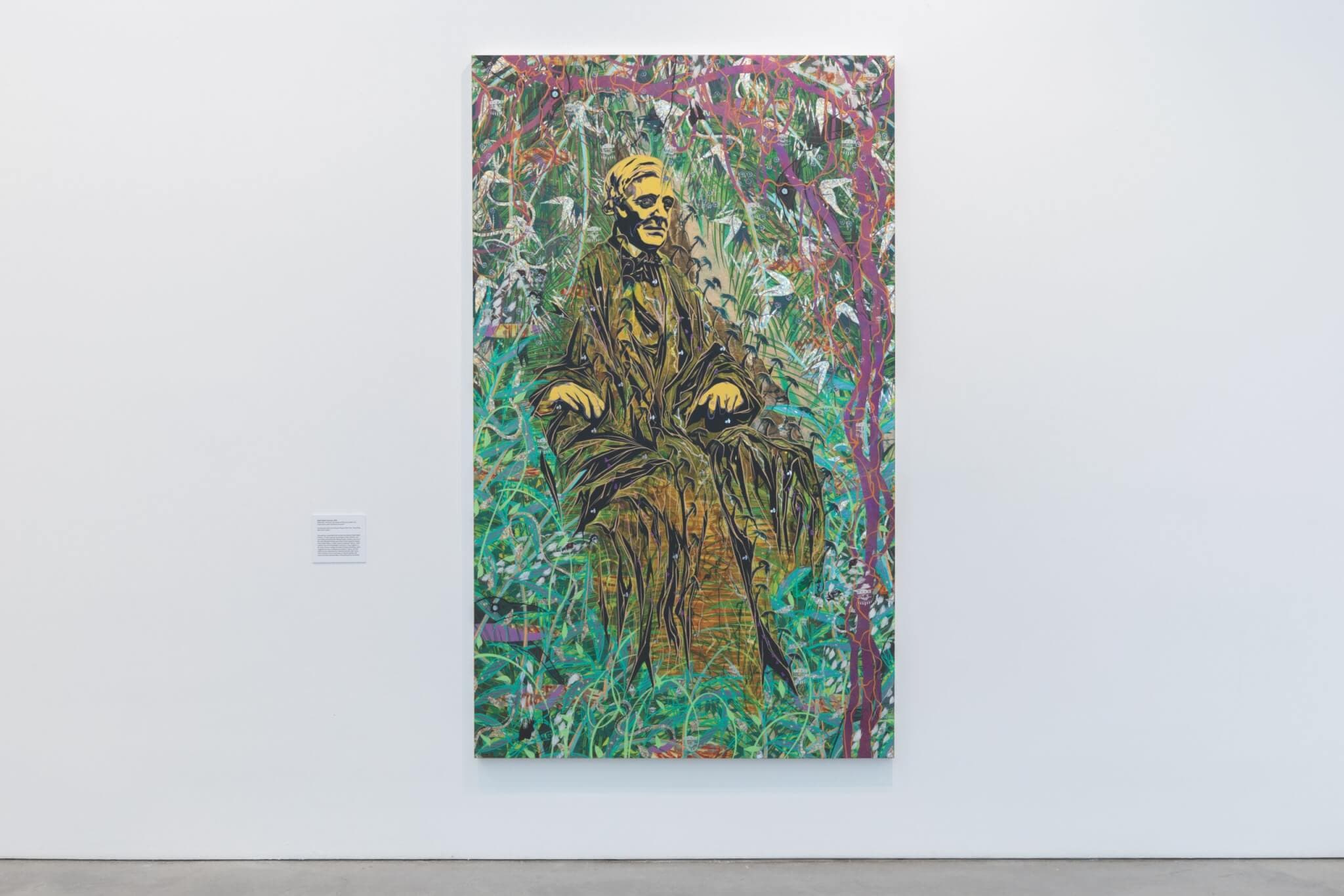 Tammy Nguyen, Ralph Waldo Emerson, 2023. Watercolor, vinyl paint, ink, screen printing ink, pastel, and metal leaf on paper stretched over panel, 100″ x 60″ (254 x 152.4 cm). Courtesy the artist and Lehmann Maupin, New York, Hong Kong, Seoul, and London. Photo by Mel Taing. 2023 © Tammy Nguyen.