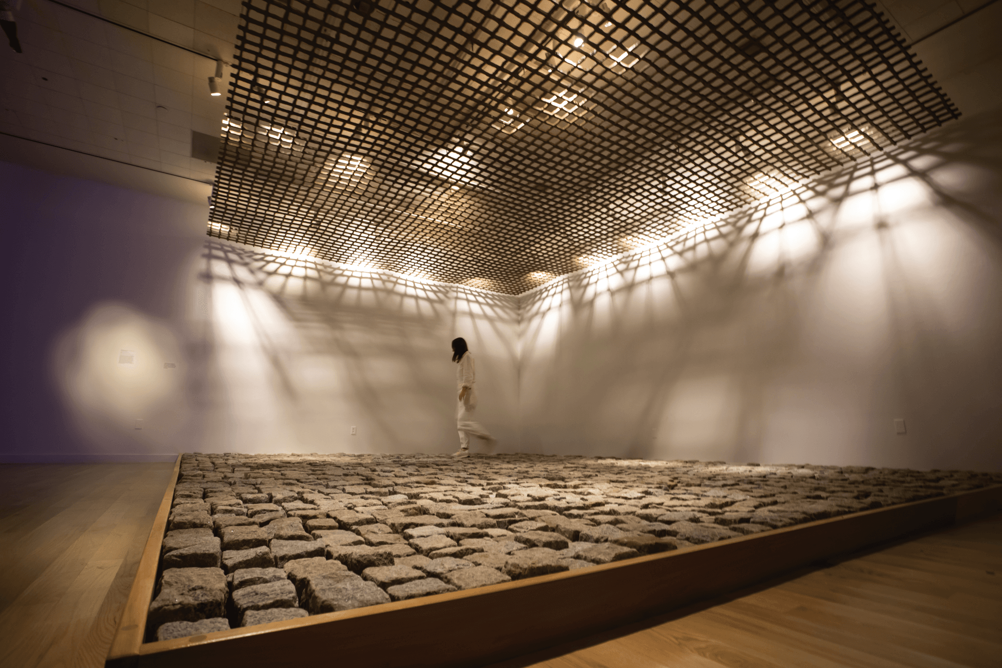 The steady sounds of underwater breathing lead to the lower-level galleries and an encounter with Ergin Çavuşoğlu’s immersive video work Lundy, Louis, Barge and Troy (2014), which emerges from the dark as a two-channel installation featuring a World War I shipwrecked fleet (seen from above) in parallel to the contemporary vessels traversing the blue waters like shadows from above (seen from below). The continuous dissolution of empire is evident in these mirrored images featuring different temporalities of imperialist maritime ruin and new ruins in the making. Lastly, Nadia Kaabi-Linke’s Road Works (Remont II) (2021), recreates a cobblestone pavement in Kyiv, Ukraine within the gallery space, to reflect on personal histories of migration and border crossing, as well as an endless cycle of crisis and reparation that draws from the work’s title. Not easily translated, the Ukrainian word remont gestures toward an endless state of less-than-optimal renovations grounded in a place, such as to a road by the local people who travel it every day. Kaabi-Linke translates this precarious installation of unfixed stone into an embodied experience rather than one of voyeuristic artifact, on which viewers are invited to walk across its unstable surface and reflect on their own simultaneous crossing of borders and rootedness.