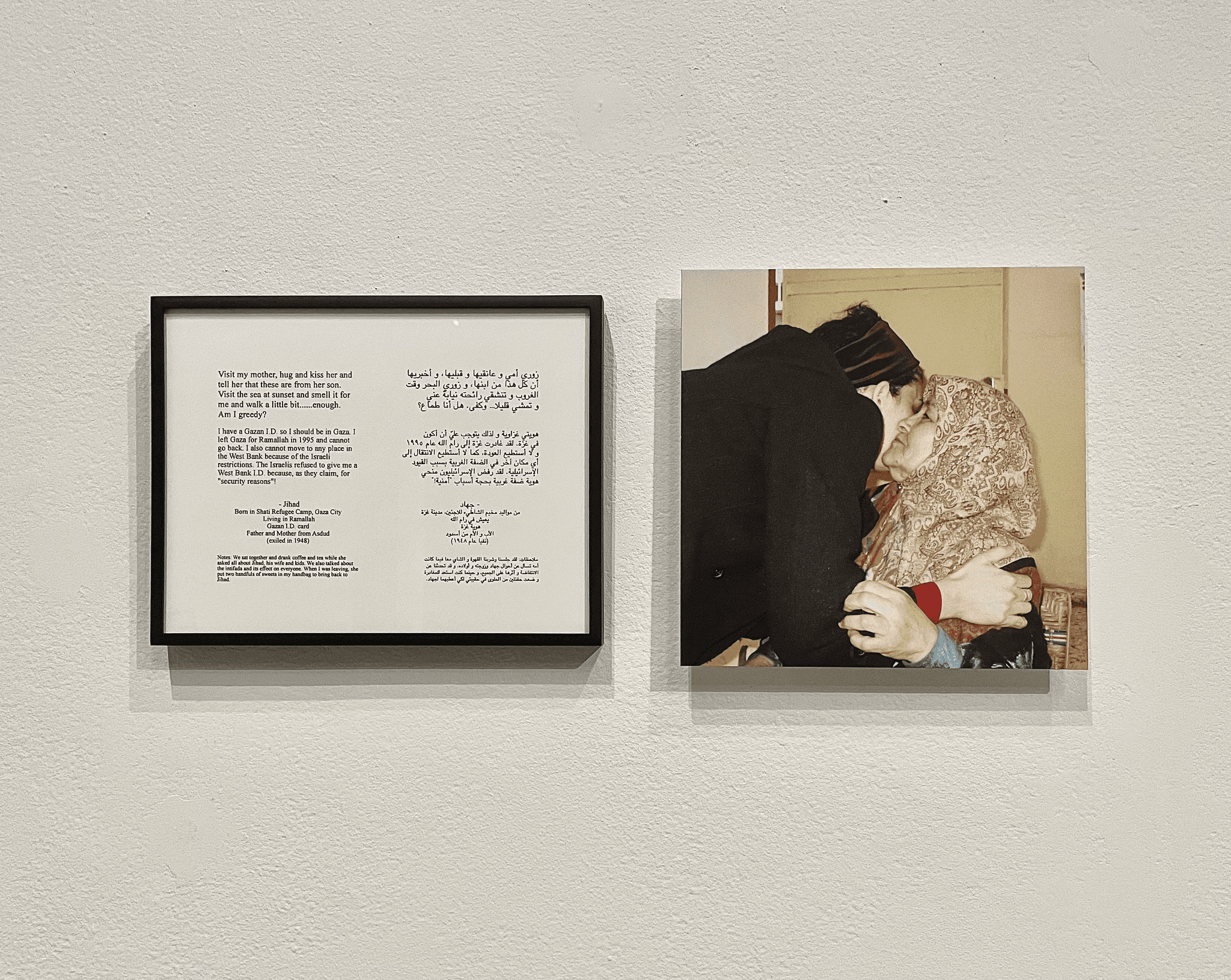 It seems poignant that these empty arms extend towards Emily Jacir’s photo and text documentation series Where We Come From (2001–2003). Perhaps the most moving of the works in this exhibition, the project features a selection of thirty responses to a question posed by the artist to displaced Palestinians across the world: “If I could do anything for you, anywhere in Palestine, what would it be?” The responses range from “drink the water in my parents’ village” to “go to my mother’s grave in Jerusalem on her birthday and put flowers and pray.” Jacir, who holds a passport that allows her to move freely between territories, executes each request and photographs each encounter. The pairing of text and image here amplifies the poetic as well as political nature of such border crossings on behalf of others. Each becomes a kind of relational portraiture of exile, longing, despair, and also love, simplicity, and kinship that both comprises and connects each individual within a dispersed diaspora.