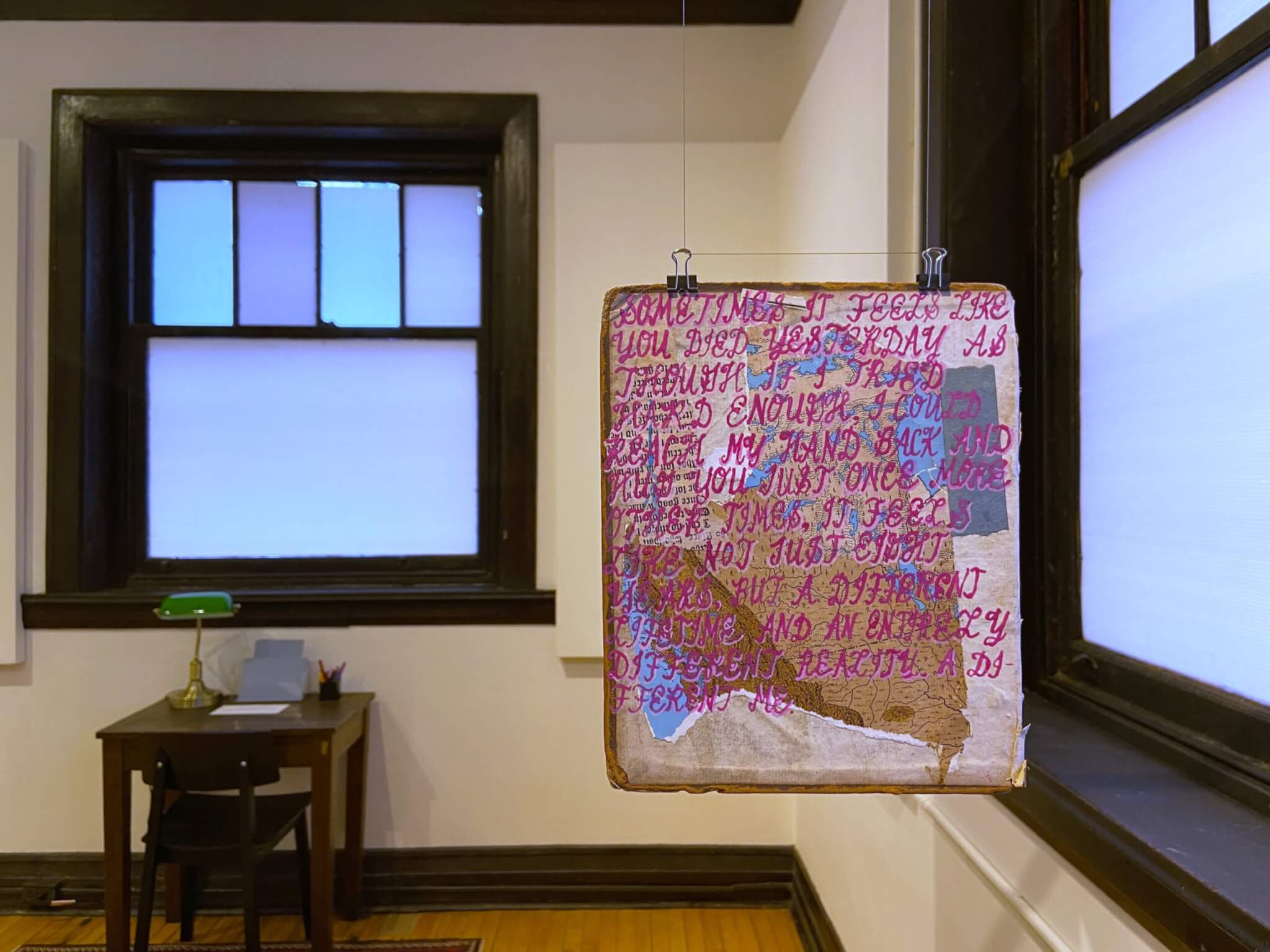 In the gallery, there is a desk with a short stack of blue paper and a cup of markers and pens. Visitors will find the invitation “If you have lost someone and wish to write a note or letter to them, please use the paper provided and add your note to the installation by tucking it into the ribbons.” One note in the gallery the day I visited said, “You never gave up on me. I guess I wish you hadn’t given up on yourself.”