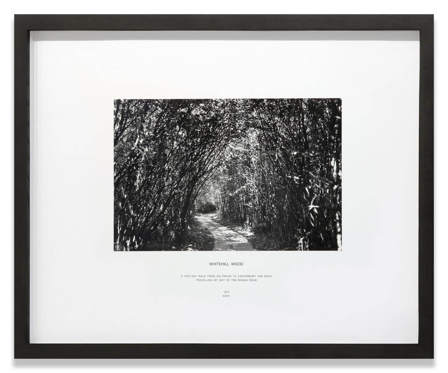 Hamish Fulton, Whitehill Wood from Crossing the English Channel, 1972, printed 1976. 14 ⅜” x 9 ⅝”. Text reads: Whitehall Wood / A two day walk from Saltwood to Canterbury and back traveling by way of the Roman road / 1972 / Kent. Courtesy of Krakow Witkin Gallery.