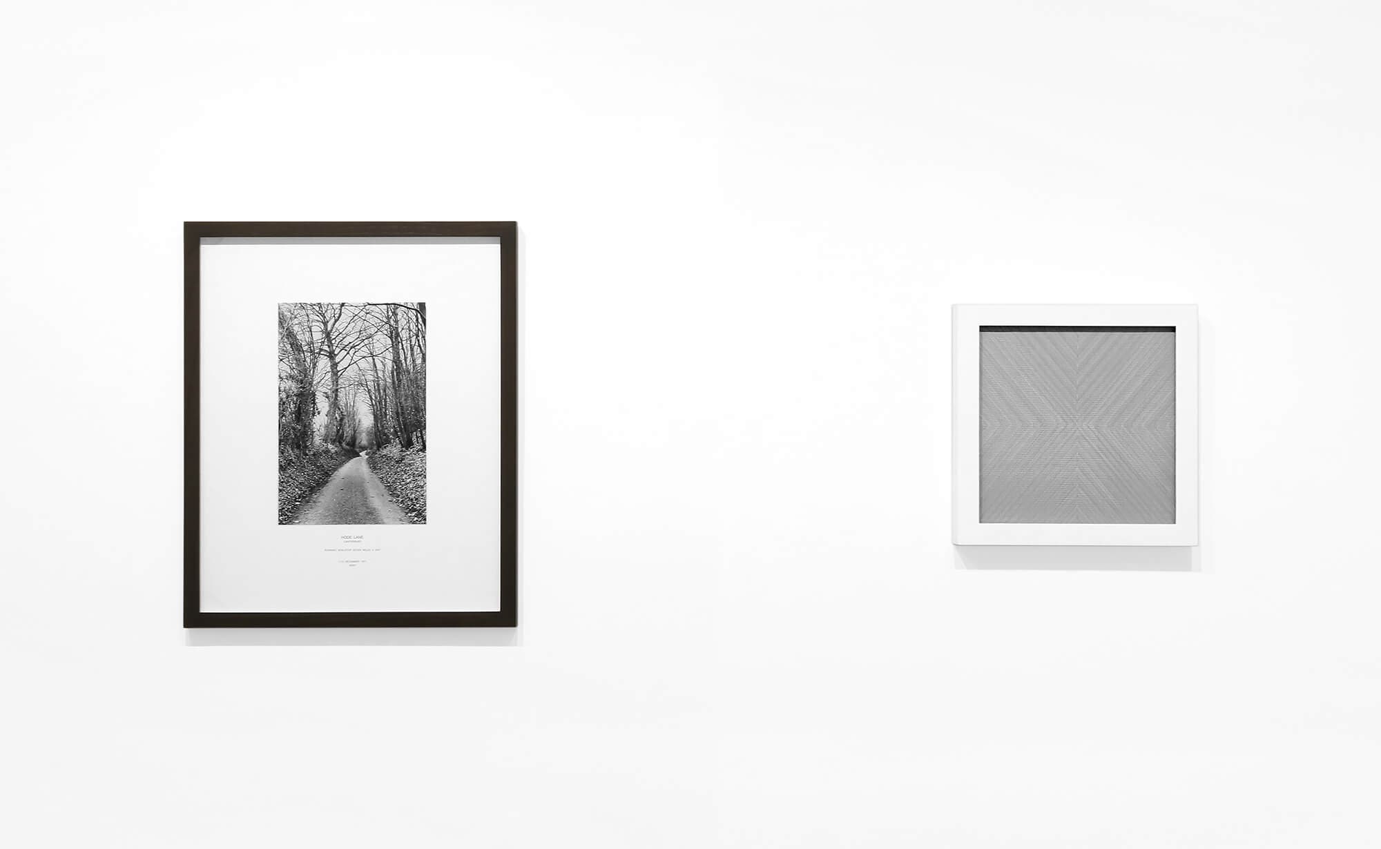 (left) Hamish Fulton, Hode Lane from Crossing the English Channel, 1971, printed 1976. 9 ⅝” x 14 ⅜”. Text reads: Hode Lane Canterbury / Running non-stop seven miles a day / 7–13 December 1971 / Kent . (right) Tara Donovan, Screen Drawing, 2021. Aluminum insect screen. 15 ½” x 15 ½” x 1 ¼”. Installation view, “Tara Donovan and Hamish Fulton,” Krakow Witkin Gallery. On view through July 19, 2024. Courtesy of Krakow Witkin Gallery, Boston