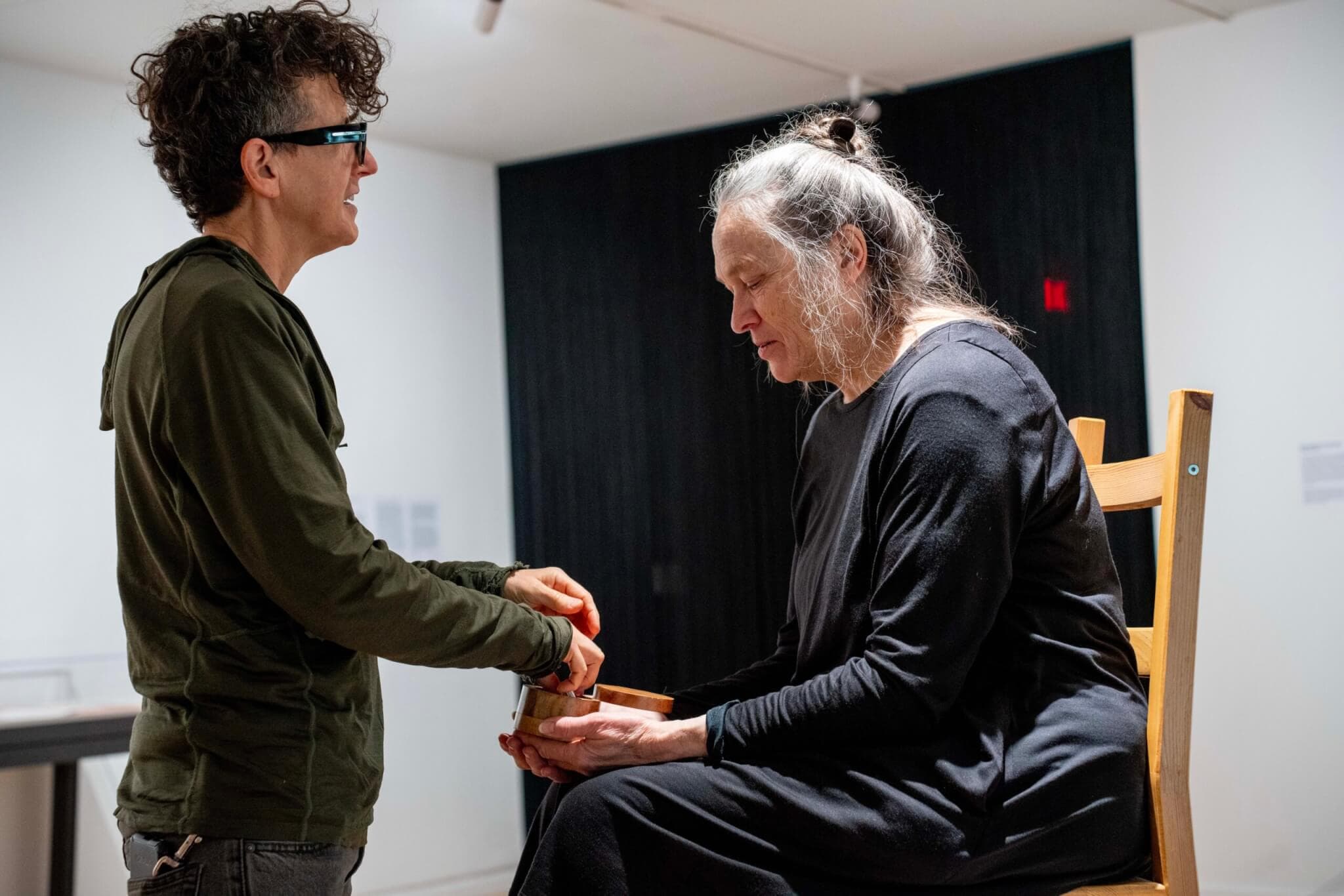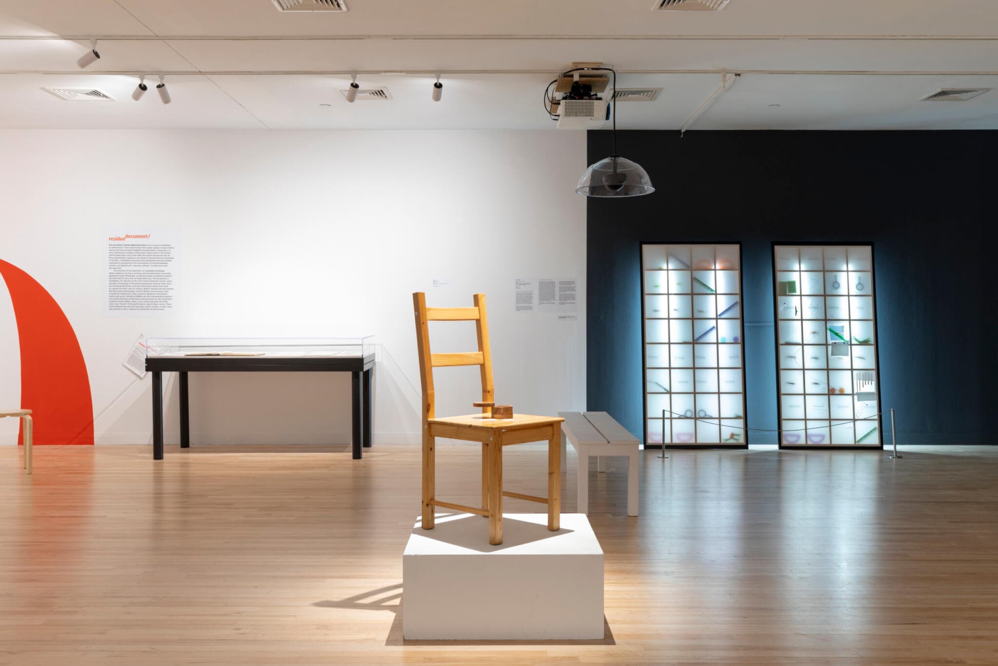 Wooden chair lent by Marilyn Arsem. Installation view, “an archive and/or a repertoire,” Tufts University Art Galleries, Boston, 2025. Photo by Mel Taing. Courtesy of Tufts University Art Galleries.