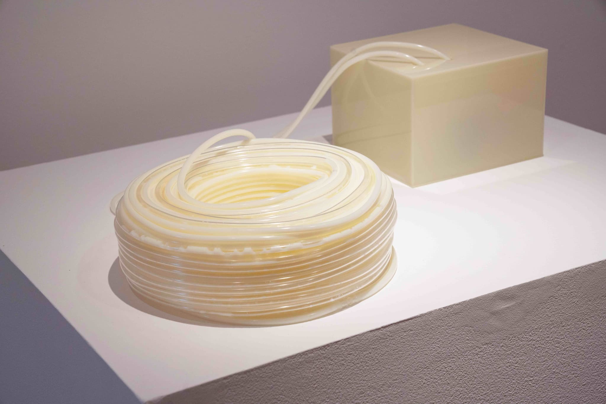 Ani Liu, Untitled (pumping), 2022. Technical advising by William Liu and Julian Goldman. Food grade tubing, liquid pump, air pump, steel bracket, brass tube adapters, hose clamps, valve adapters, valve splitters, solenoid valve, microcontroller, synthetic milk. Courtesy the artist. Photo by Yukai Chen M’23.