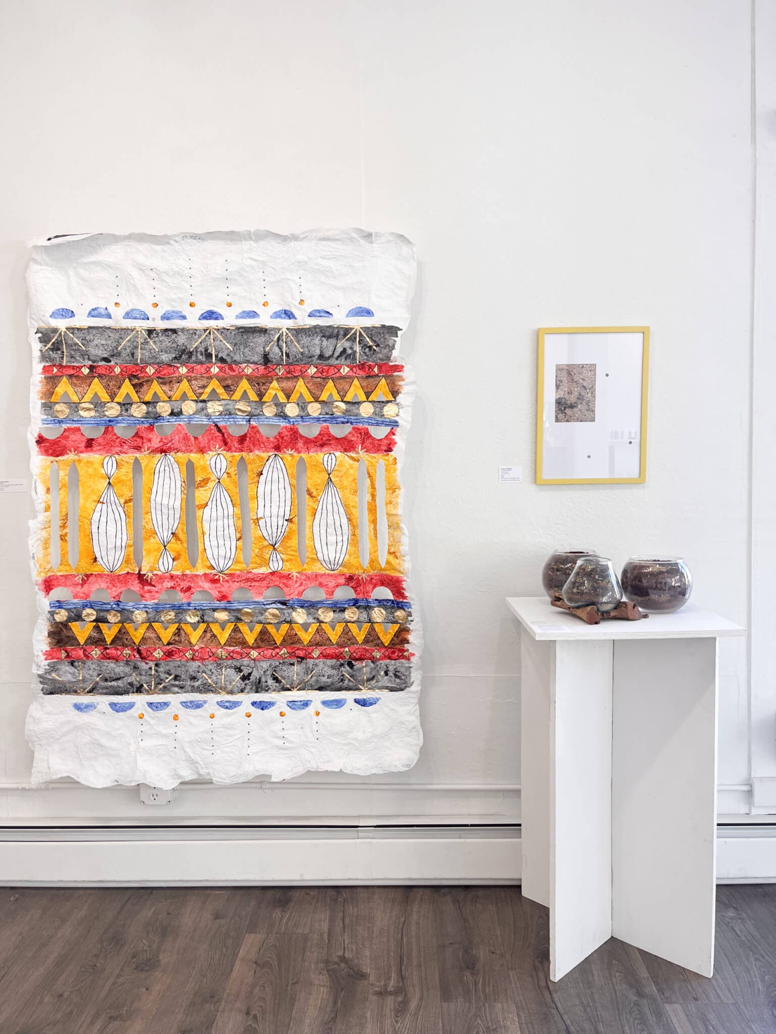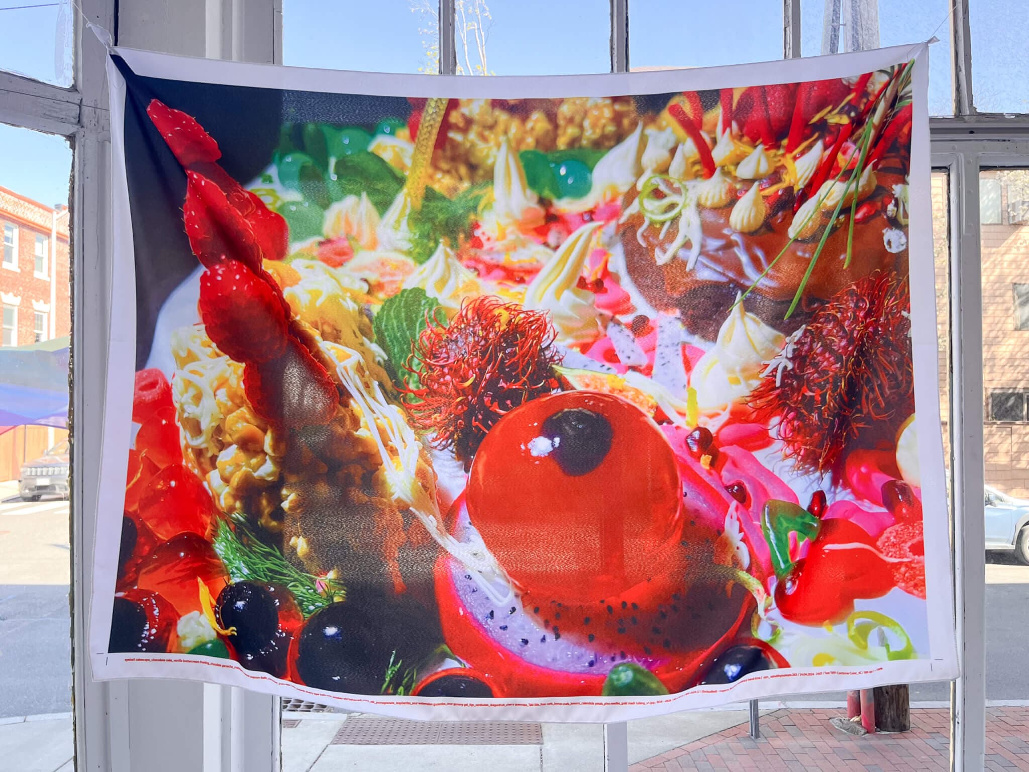 Gallery 263’s newest group exhibition, “Eat With Your Eyes,” can be seen from a block away. Hanging against the front window is Cakescape 13, a tapestry printed with vibrant fruits and oozing baked goods by Marcel Marcel, a queer installation artist with a studio in the Boston Center for the Arts. As you enter the sun-soaked space, you see the fabric floating to your left, and the other twenty-four artists’ works surround you, inviting you to indulge.