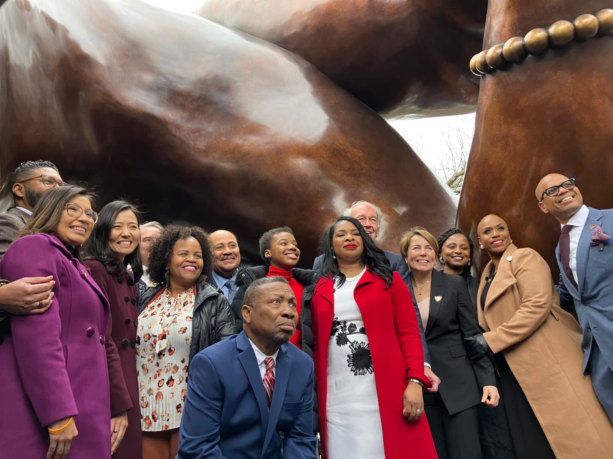 Elected officials and distinguished guests, including (from left to right): Miriam Ortiz, Imari Paris Jeffries, Mayor Michelle Wu, former mayor Kim Janey, Martin Luther King III, Yolanda Renee King, Arndrea Waters King, Sen. Ed Markey, Gov. Maura Healey, Sen. Ayanna Pressley, and Demond Martin, among others gathered under the sculpture.