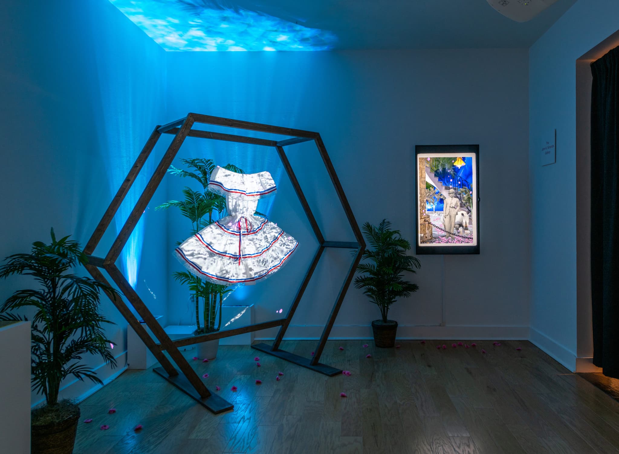 A separate, dimmed room lends itself well to the mesmerizing installation by Allison Maria Rodriguez, In the Presence of Absence, displayed as a small devotional space. A traditional Cuban dress, hung in the main corner, appears weightless among potted palm trees; the floor is covered in pink petals and the soft light emanating from nearby flat screens makes them almost appear as stained glass windows. In her projections, sepia photographs of the artist’s ancestors are placed alongside images of extinct species while Cuban monuments are arranged against a bright backdrop resembling meteorology charts tracking hurricanes that have devastated Cuba in recent history. One can read it as a looming threat of climate change that will affect innumerable lives and species, or as an act of resistance against letting these collective and personal memories fade to black.