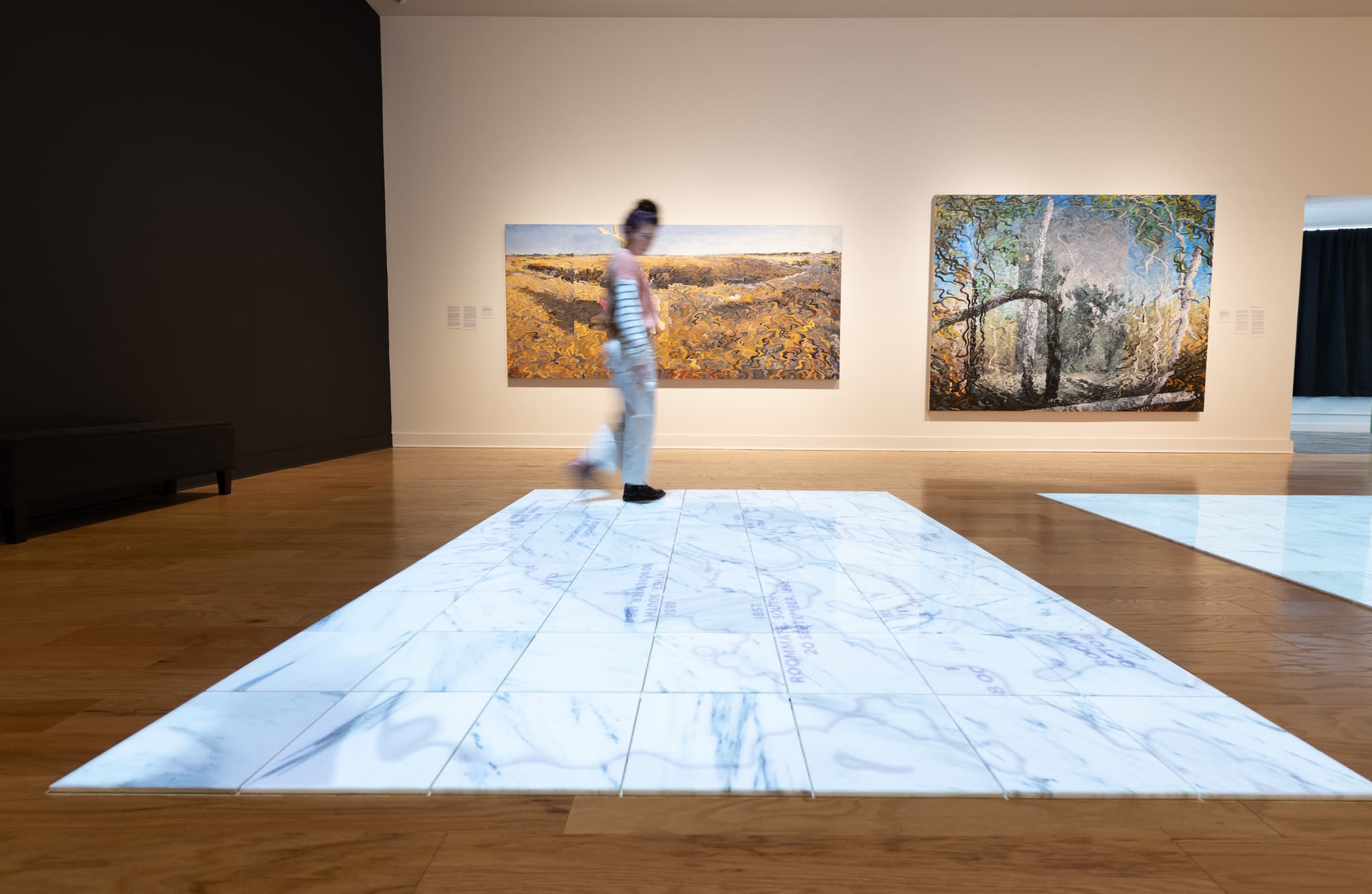 Brian Knep, Deep Wounds, 2019, interactive video installation with tile formations. Photo by Charles Sternaimolo.