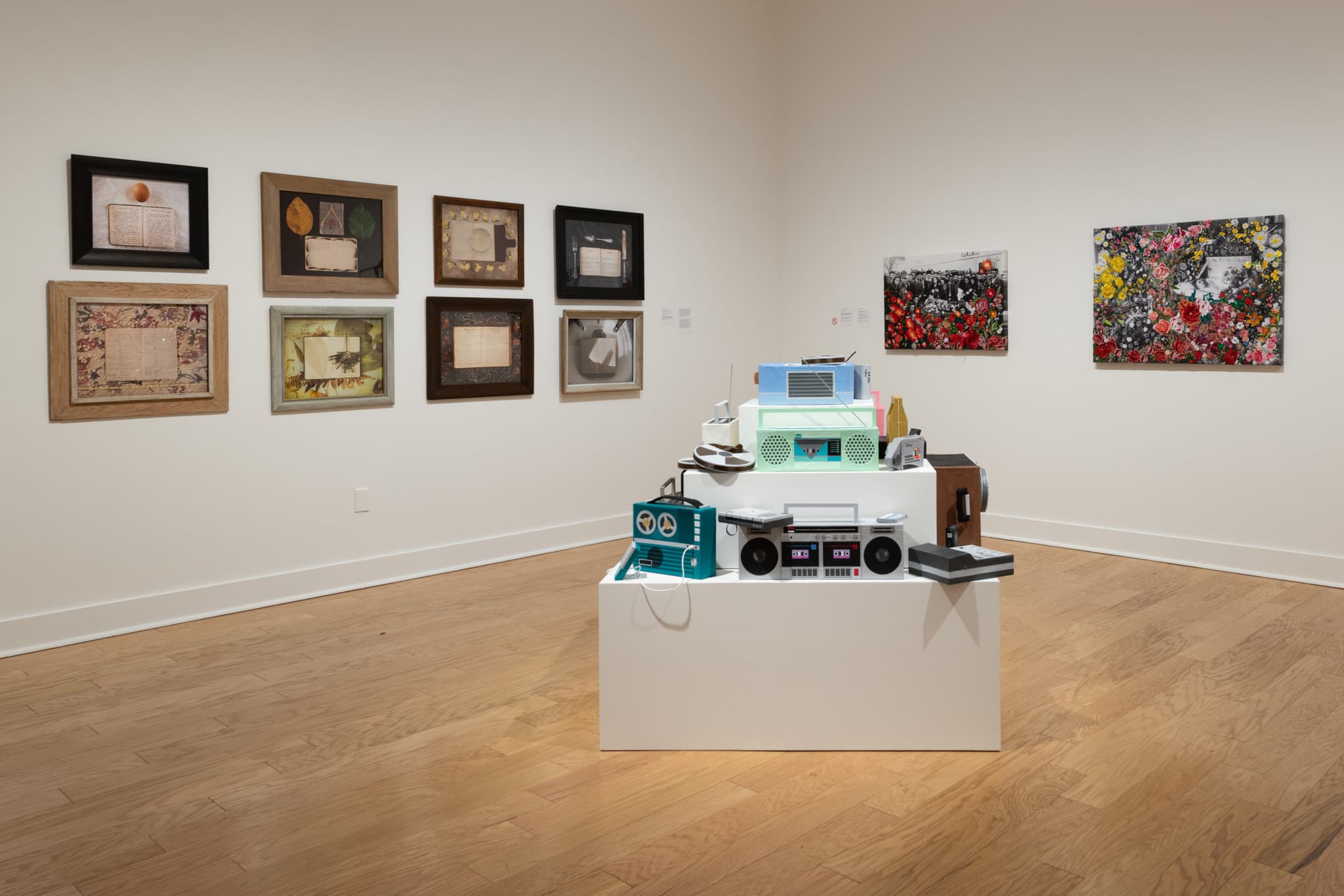 Center: Julie K. Gray, Untitled (EVP Recording Altar), 2019. Left wall: Rose Marasco, Diaries, 1994–2000, dimensions variable. Right wall: Julie K. Gray, Postmortem: Aleksandr (left), 2019 and Postmortem: Margaret (right), 2019. Photo by Charles Sternaimolo.