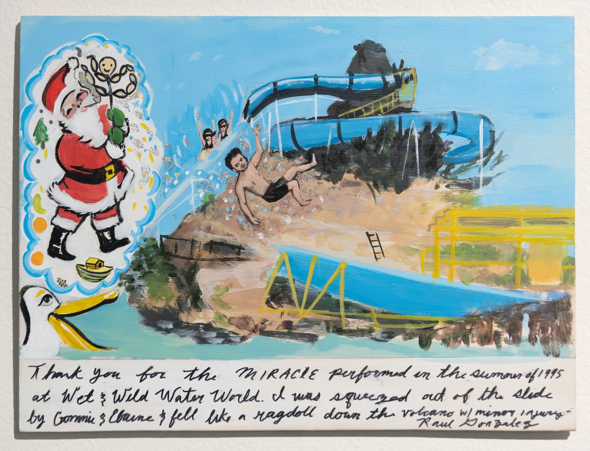 A tiny table set on a pedestal is covered in figurines of winking Santas. Above it hangs a cutout calavera, an ornate skull usually associated with the Day of the Dead, this time cleverly composed of Christmas imagery: a black hole around its nasal bone is replaced with a cheerful Christmas tree. To the right, a row of ex-votos—typically Christian votive offerings to saints or other divine figures—narrates true near-death experiences, ranging from almost fatally falling off a Water World ride to nearly setting the house on fire at age five after discovering the pleasures of lighting a match.