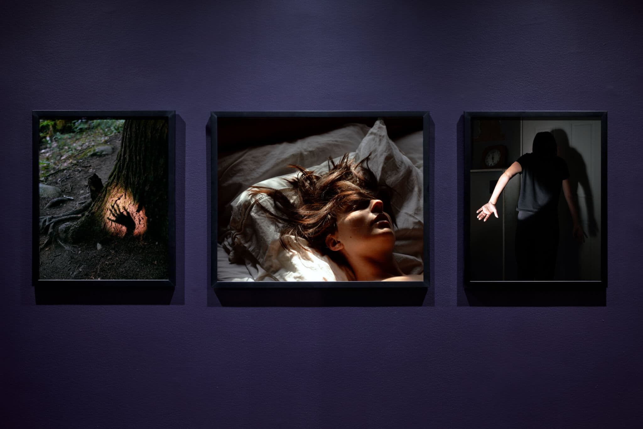 The most powerful juxtaposition are three images, all self-portraits, against the far wall. These photos tell a narrative of a woman working to discover her own identity regardless of culture or politics. She is intimate with the light and camera, almost like they are her lovers, creating images that are much more visceral than the other photographs in the gallery. We also see Altman work through her influences and photography history. The left image stands out for its visual abstraction and use of exposure to challenge our visual perception. Showing the shadow of a hand illuminated in a circle of light on the base of a tree, it stylistically connects to modernist photography. The center image, the largest of the three, is a close portrait—the viewer would have to be sitting on the edge of the bed, their body touching Altman’s, in order to achieve the vantage point. Hair spread across the bedding reminds one of Sally Mann’s The Two Virginias, speaking to the vulnerability of time on our bodies. The light illuminates the contours of the face while the eyes are in shadow and the hair obscures the forehead. The intimate nature of the bed linens is palpable in the sharp focus of the image. In the right image, the subject’s body faces away from us in an awkward, almost creeping position à la Francesca Woodman. The figure moves toward a closed door but is too close to easily open it, the left arm reaching back, the hand open toward the viewer yet slightly claw-like in its rigid position and illuminated fingernails. Like many of Woodman’s photographs, the image evokes ambiguous feelings toward this female body. As a grouping, these three images seem less constructed and labored over, more intuitive—this is when the artist is at her best.